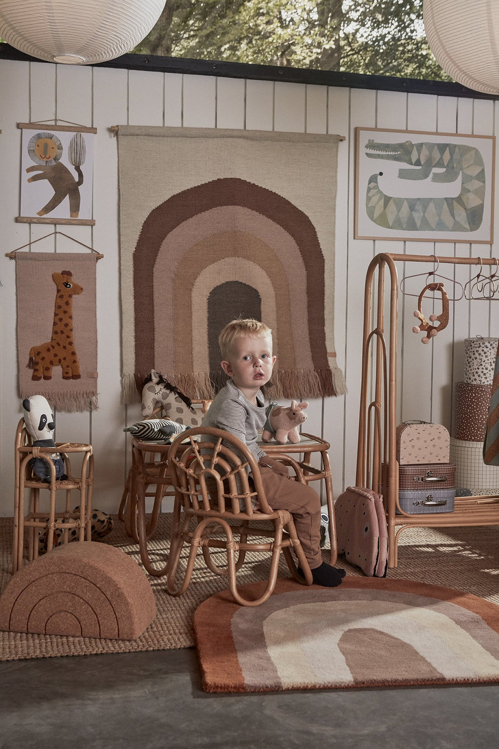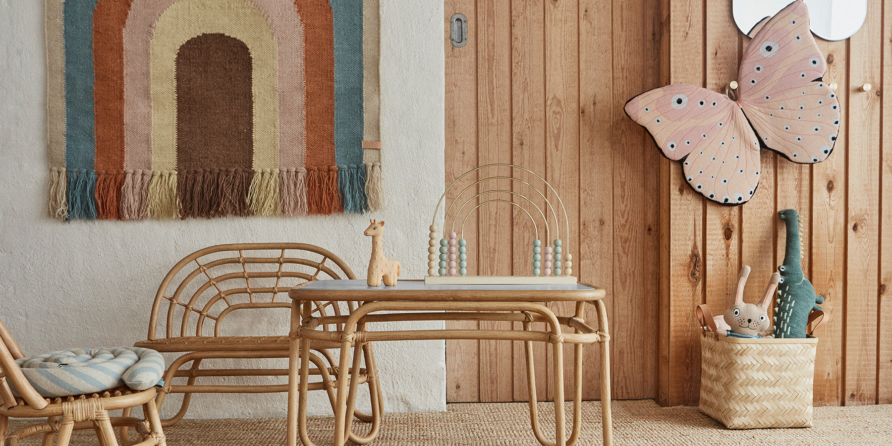 Achieve a cozy and stylish play area with rattan furniture, including a table and chairs set. Enhance the look with our favorite rainbow wall tapestry. Incorporate soft lollipop cushions and a vibrant rug to create a comfortable and inviting space for your child to play and learn.