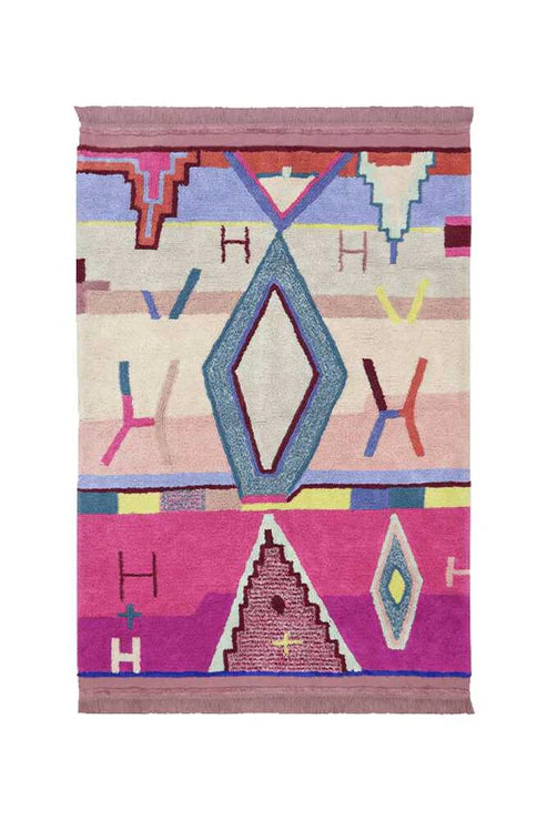 Web Exclusive! This model will transport you to the magic of Scheherezade's 1001 Nights. Cotton washable rug suitable for conventional washing machine (8 kg capacity), color is the absolute protagonist of this model: base dyed in ash rose, 15 different colors have been combined, ranging from bright, well-defined colors to nuanced or natural ones, creating areas and ethnic motifs that add personality and character to any room in the home, whether it's a children's room, or more home environments, from a living room or bedroom, including a terrace or garden. Individually hand-made by craftsmen, natural dyes have been used and, as it is made with cotton, it is light and soft. Discover the whole Morocco collection from rugs and cushions to wall decor, baskets and blankets.
