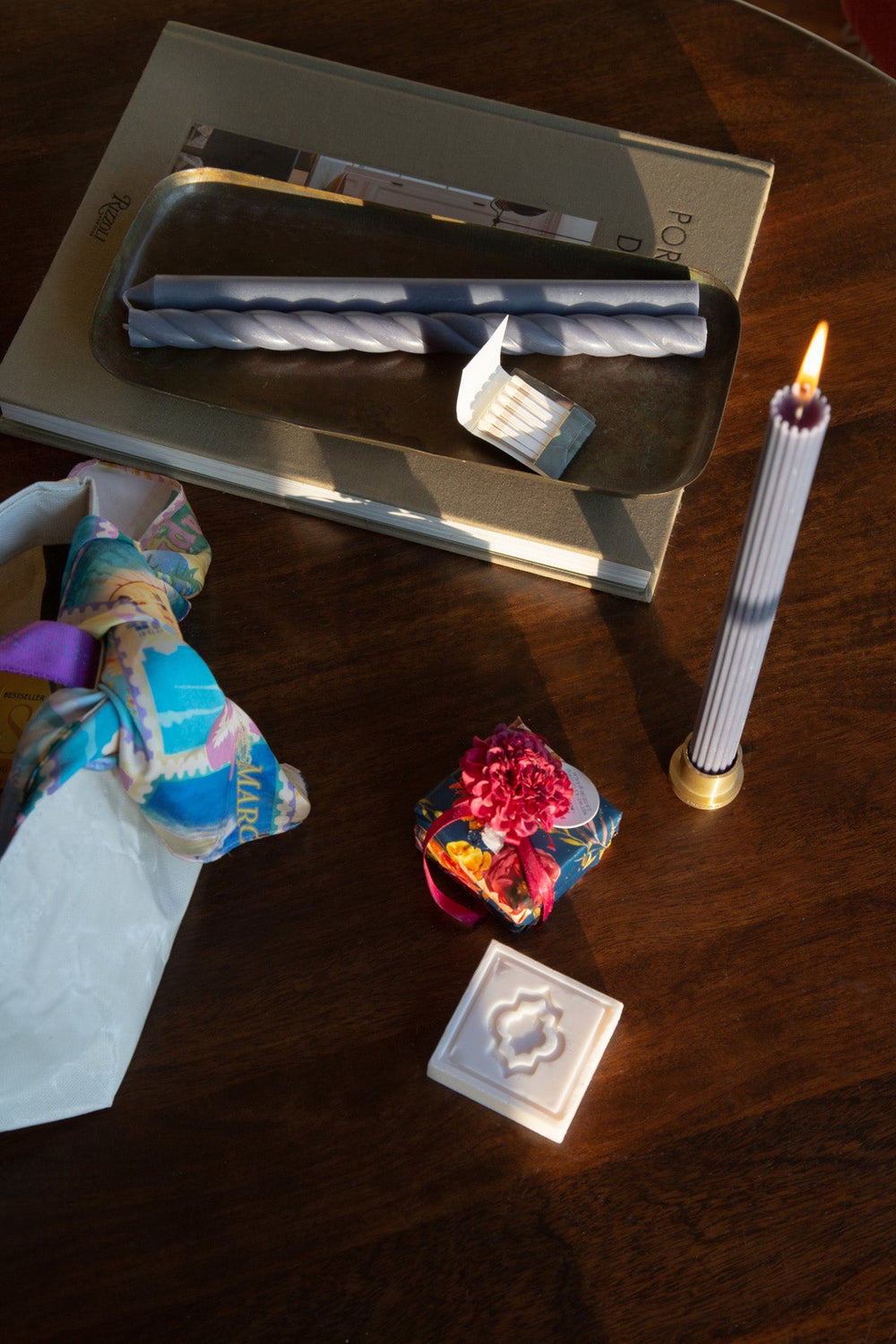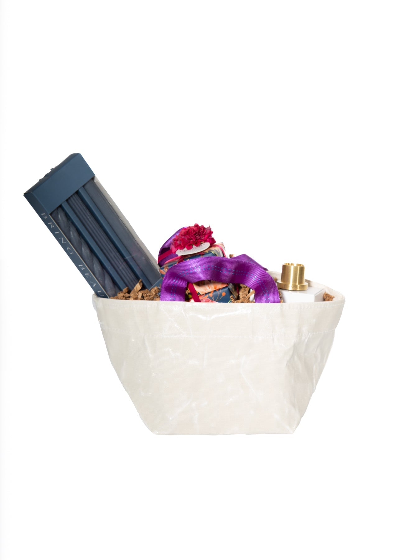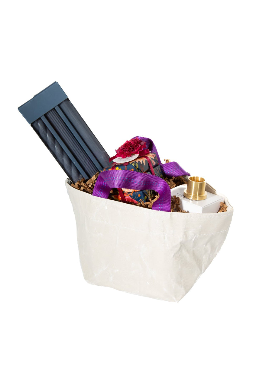 A thoughtful gift for the hostess who knows how to set the scene. This miniature tote holds everything she needs to elevate her space—one elegant brass taper holder, a set of three sleek candlesticks, and a refreshing hand soap to keep things feeling fresh. Perfect for adding a little extra warmth and charm to any gathering.