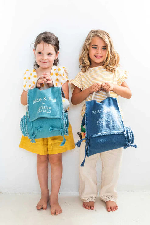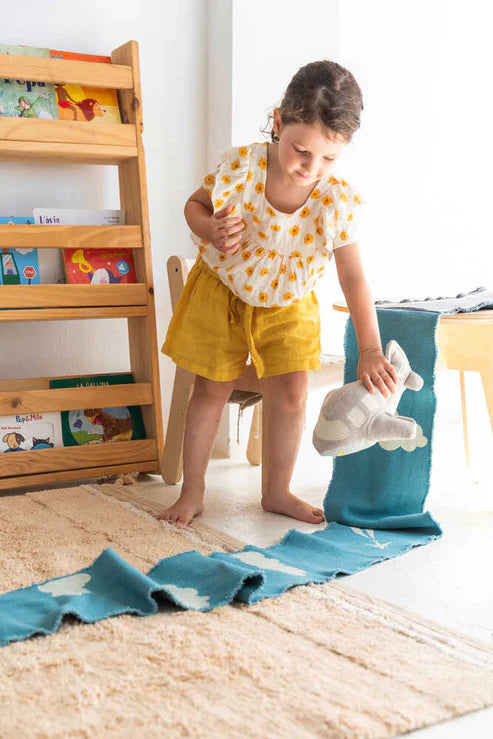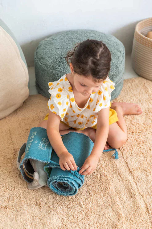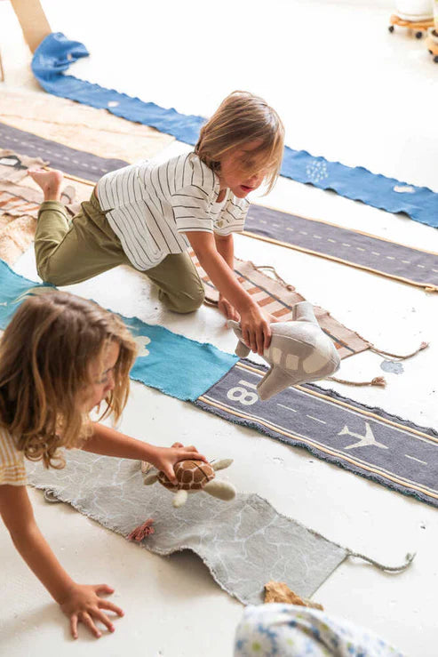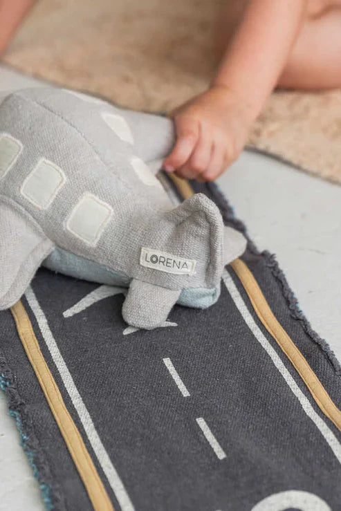 A Ride & Roll Airplane with a long runway to fly far and beyond! This handcrafted textile toy is made from scraps from our own factory and consists of a soft toy plane that comes rolled up in a 4 meter long canvas road in light blue color, with printed white clouds and grey patches simulating the airport runway for take-off and landing.