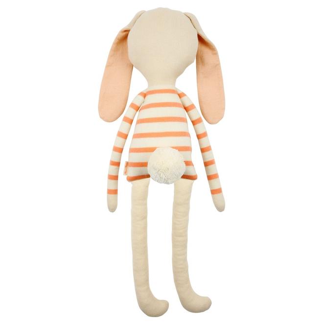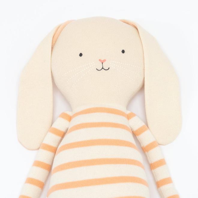 Alfalfa the bunny is truly adorable and perfect to cuddle and play with. Made from knitted organic cotton with floppy ears, sweet stitched features, and a cheeky little pompom tail.