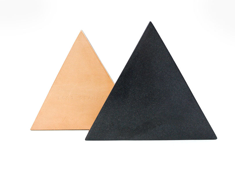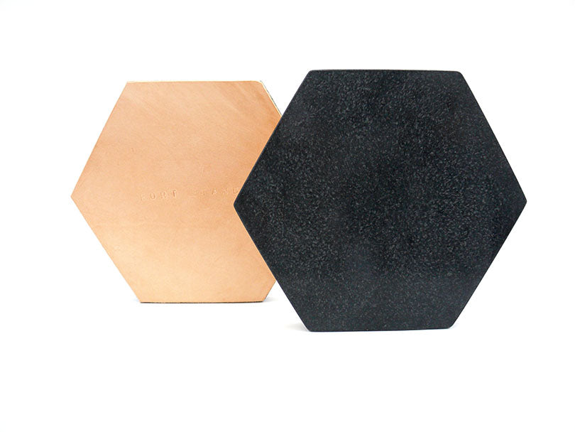 Water-jet cut from stone in New Jersey. Finished with a waxed vegetable tanned leather bottom in Brooklyn, New York.