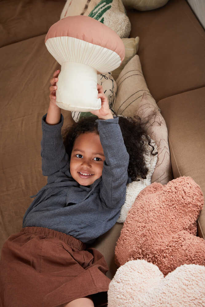 The Boletus cushion is soft and cozy. Made of organic cotton poplin, it is shaped as a mushroom, with details in embroidery, combining soft shades of Natural and Chestnut colors. Filled with soft polyfill..
