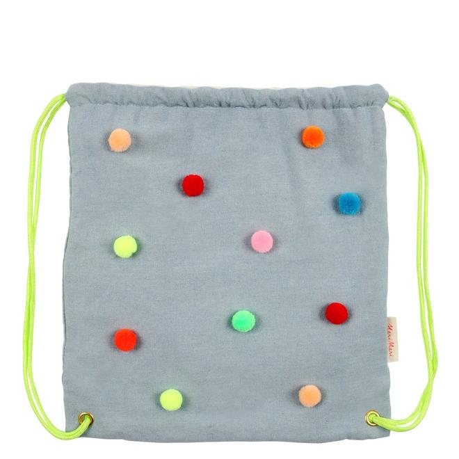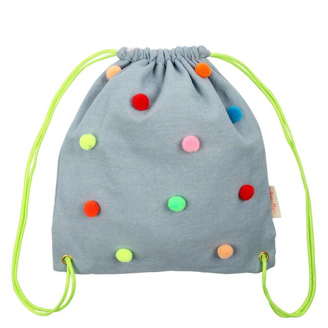This cute backpack is crafted in chambray denim and decorated with lots of brightly colored pompoms. Bright neon cord arm straps are attached with brass eyelets. It has a handy drawstring fastener and a cotton canvas inner lining.