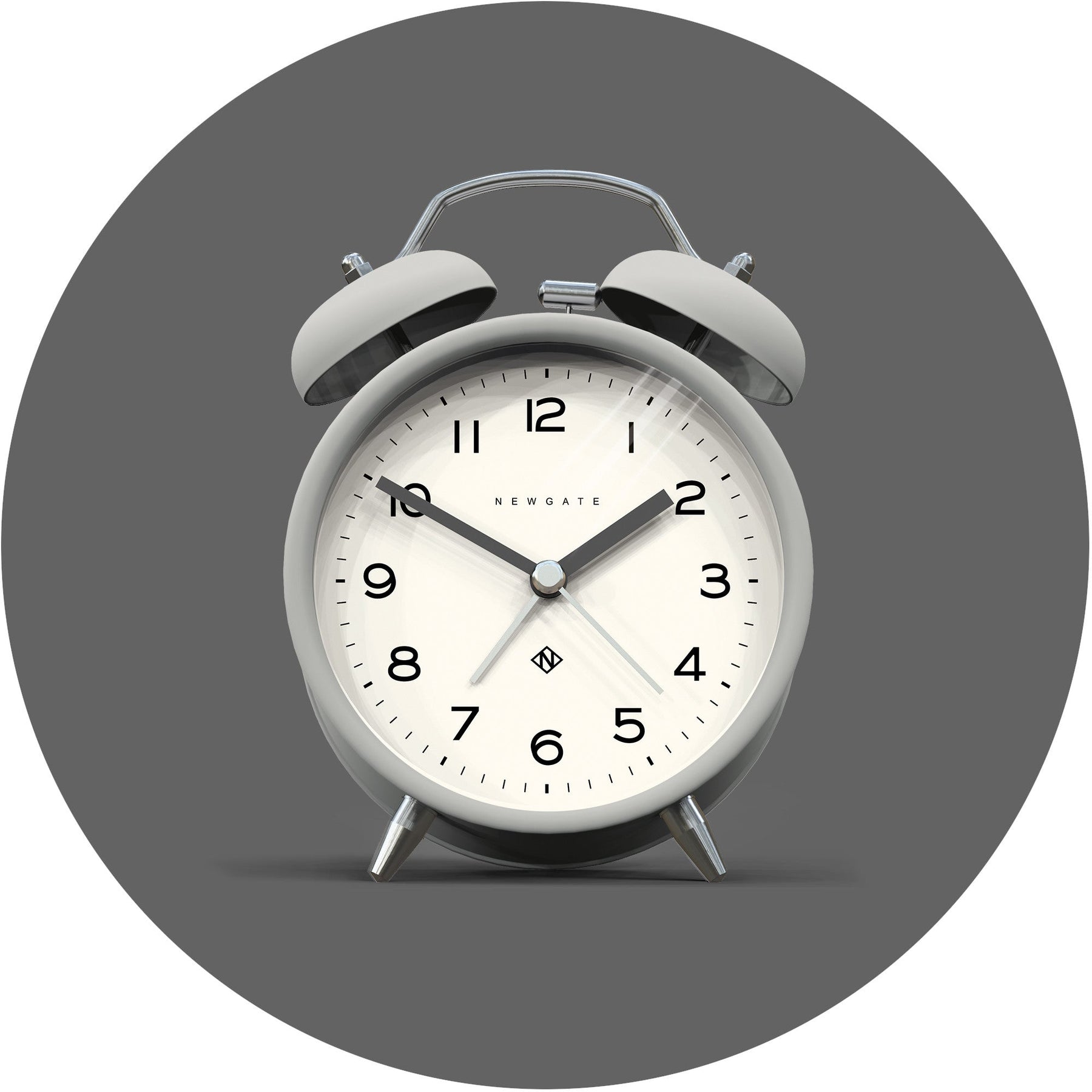 A modern grey alarm clock with a contemporary graphic dial and a moving hammer and twin-bell alarm.