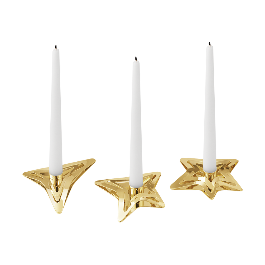 Stylish and contemporary, this set of three 18 karat gold plated candleholders will bring a modernist Scandinavian touch to any home at Christmas. Shaped like three abstracted stars, the cut-out form reflects the warm glow of the candles adding starlight magic to cosy winter evenings.