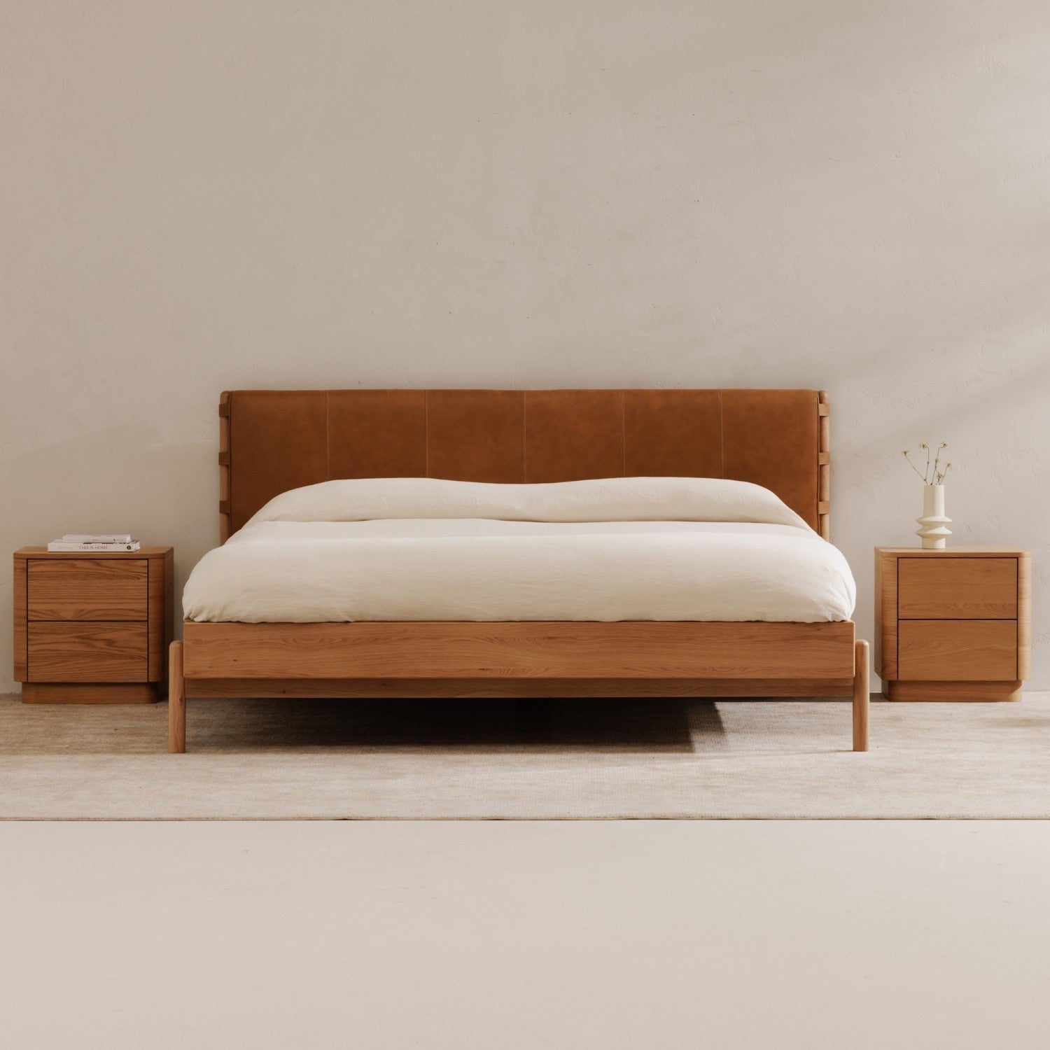 Crafted with a high-quality leather headboard and rounded solid oak legs, the Colby Queen bed frame elegantly brings understated luxury with superb craftsmanship. The soft curves of the leather headboard provide a sense of warmth and coziness, while the rounded legs add a touch of organic form to the overall design. The clean lines and natural materials create a harmonious and sophisticated piece, fitting seamlessly into any contemporary space.