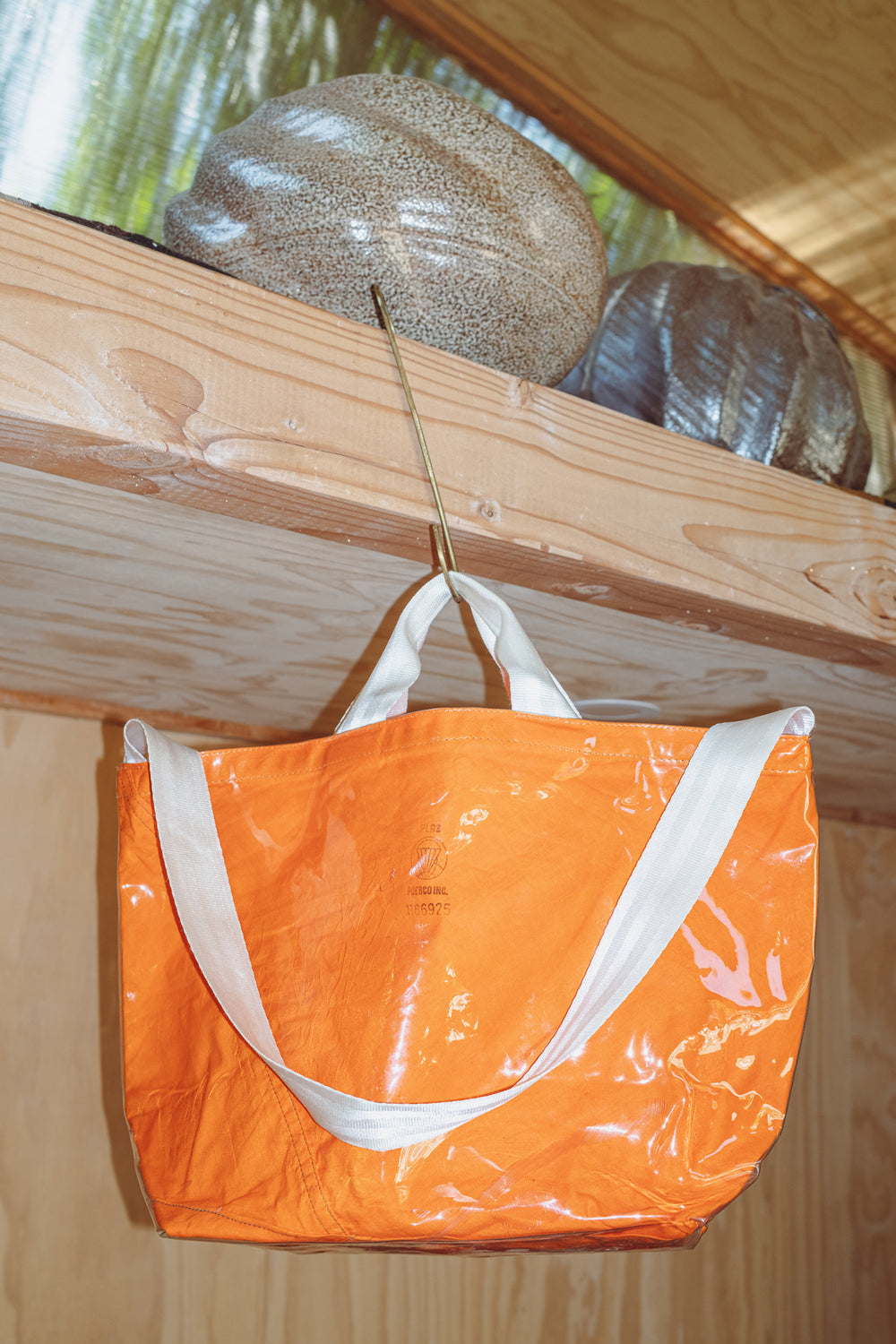 What I purchased was a large piece of parachute fabric that had completed its original purpose. It is characterized by being lightweight and strong. Although they look very similar, they are a mixture of two types: ripstop fabric, which is woven with threads in a grid pattern to prevent tears, and non-rip fabric, which is plain woven. We have developed several products that combine this fabric with handles made from recycled dead stock and used industrial belts. The material was found in a certain town in India. In an area where military surplus goods are distributed, I visited a small specialty store where used fabrics were piled up to the ceiling. I don't know if I could even call this a store because the inside is so stuffed with fabric that there's no place to step. Guided by the man in the store, I climbed up the huge pile of fabric and moved through it, searching for something that was neither this nor that. I have an attachment to this material that cannot be expressed in words, as I have spent hours struggling with it, as if exploring a cave.
