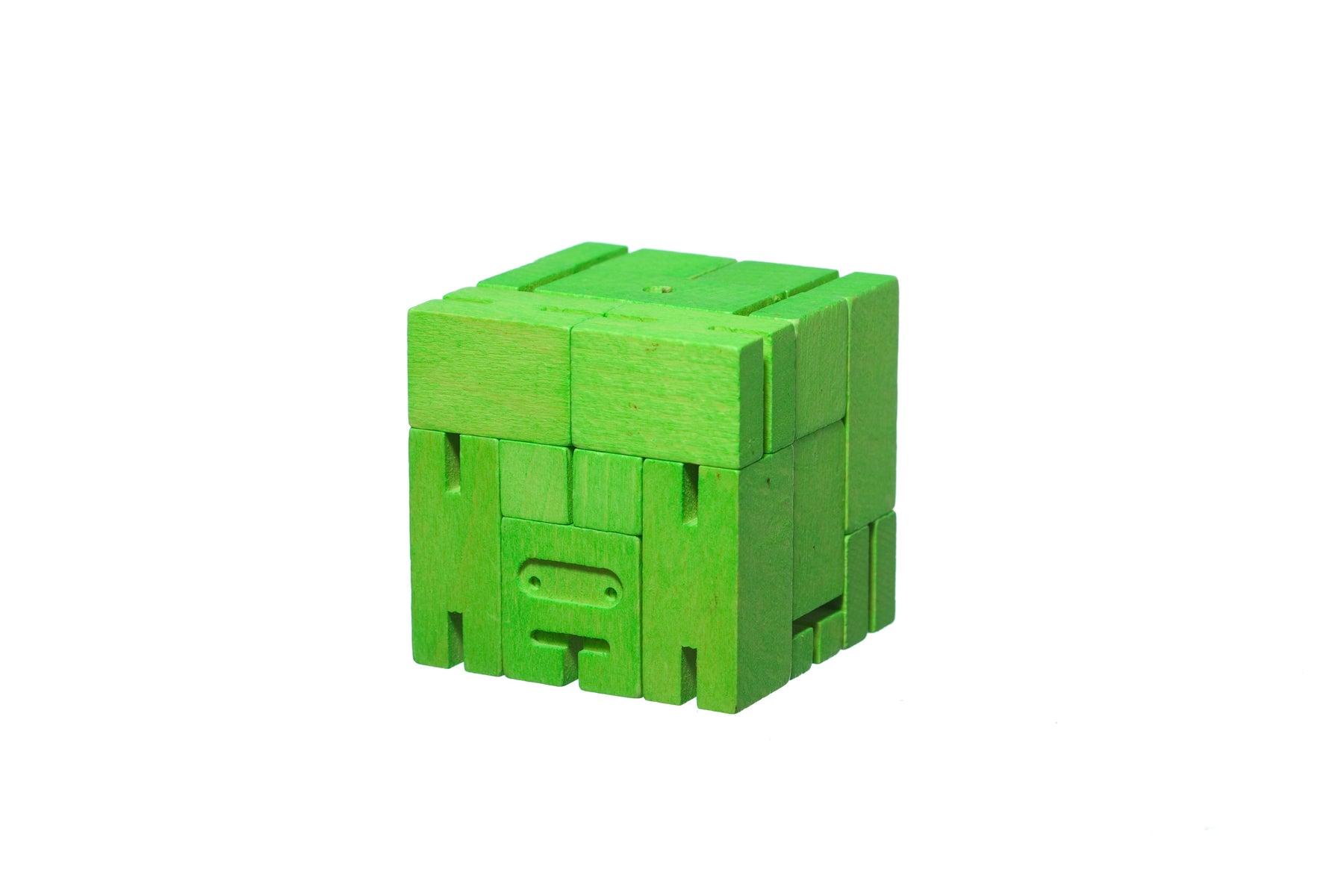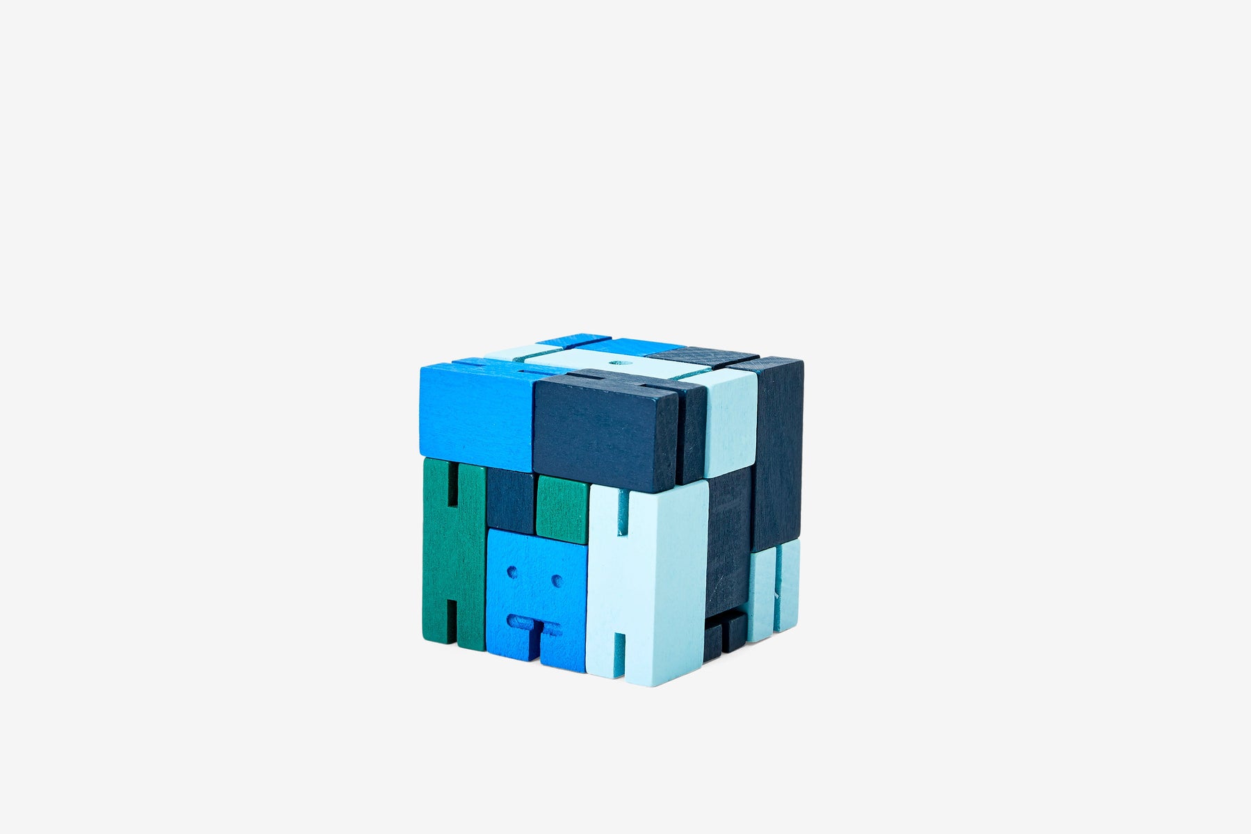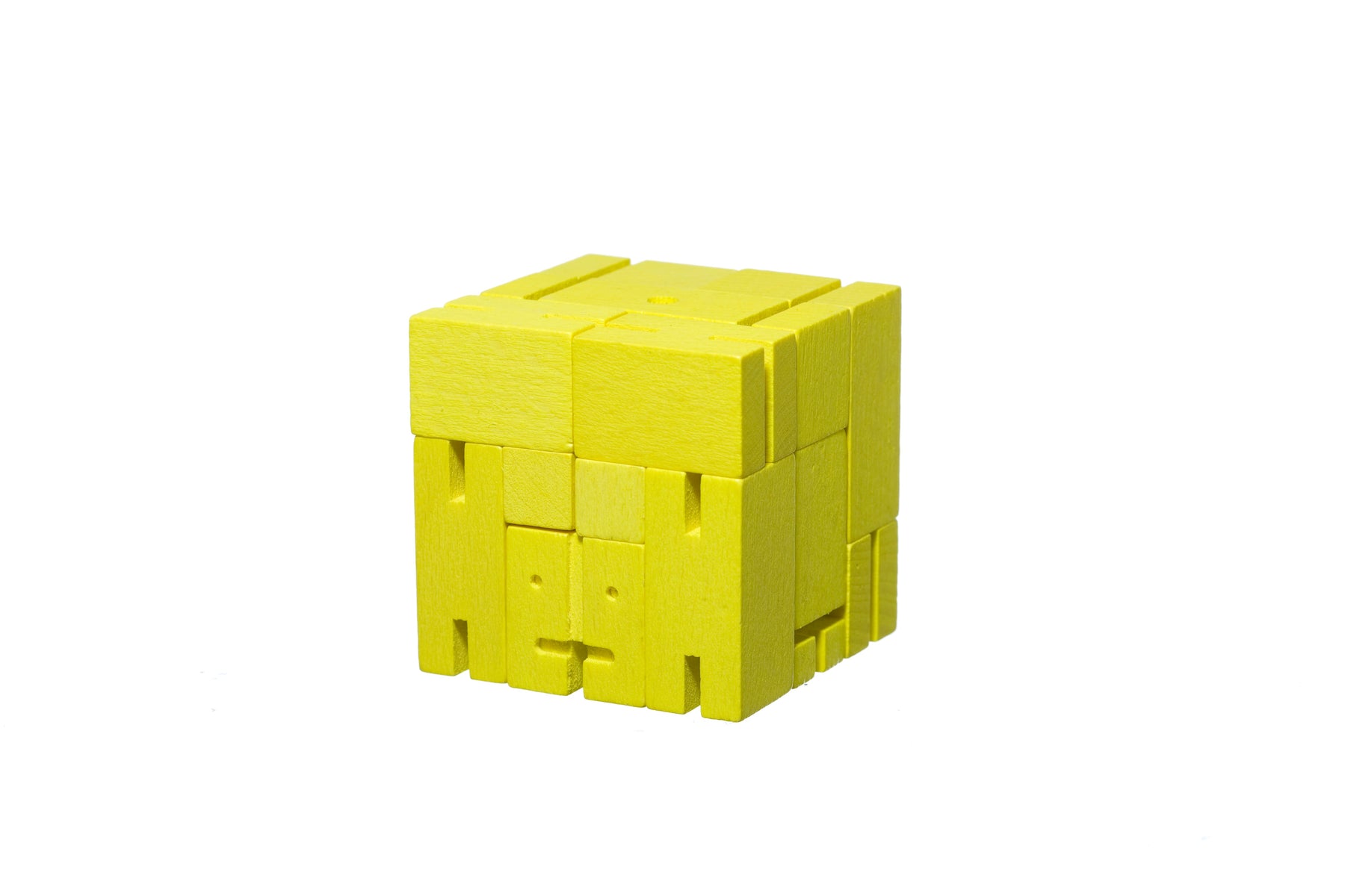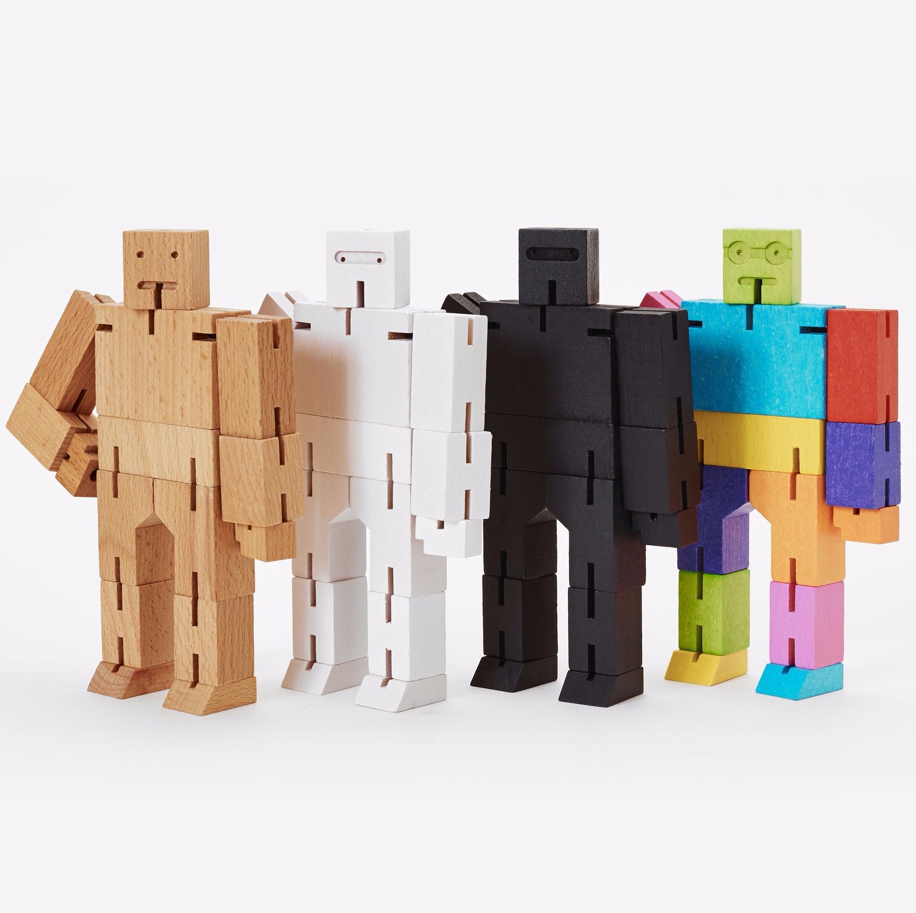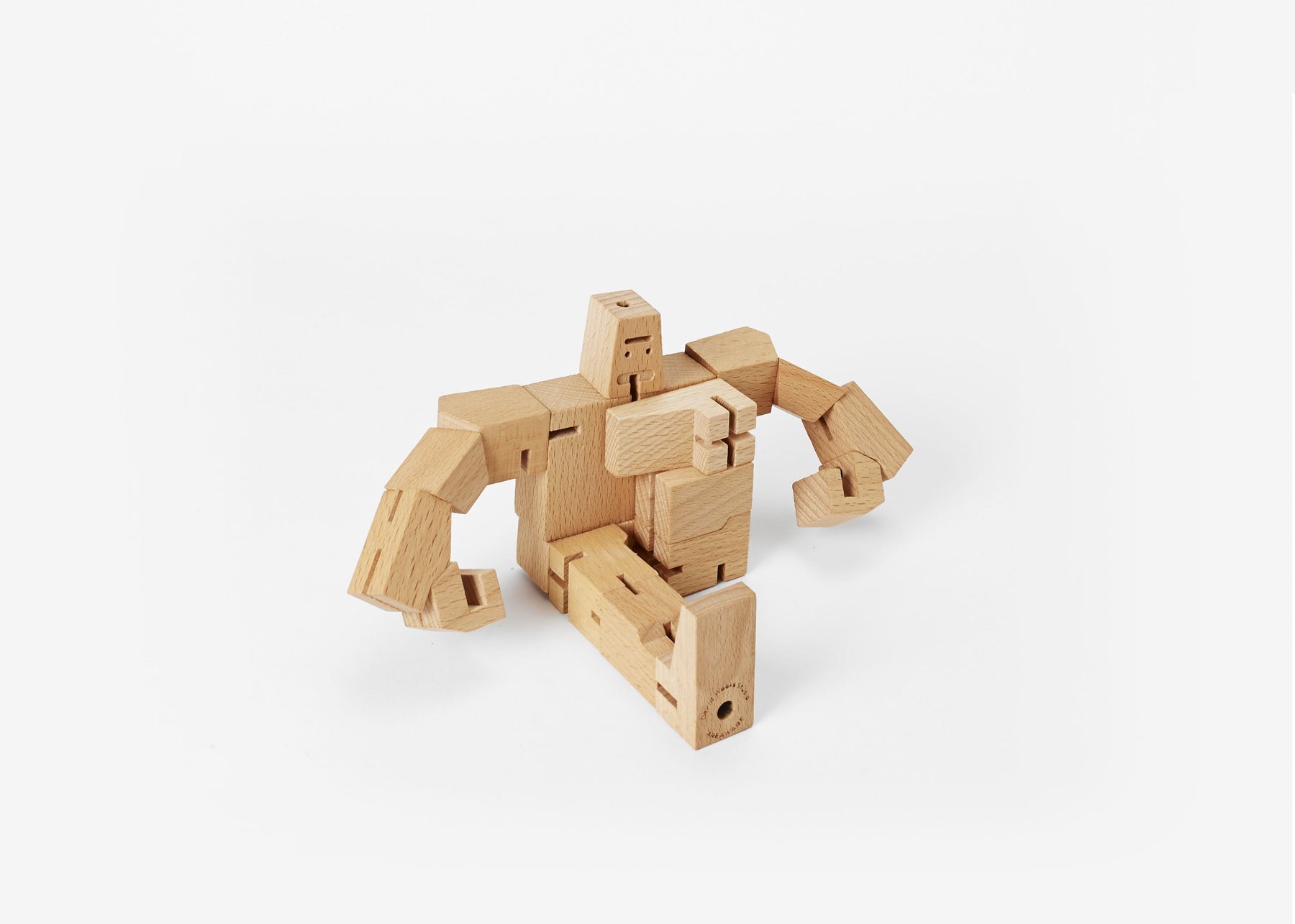 Cubebot® is a wooden toy robot inspired by Japanese Shinto Kumi-ki puzzles. Made from wood and elastic, Cubebot can be positioned to hold dozens of poses. When it's time to rest, Cubebot folds back into a perfect cube. A classic toy for all ages that will endure generations of play.