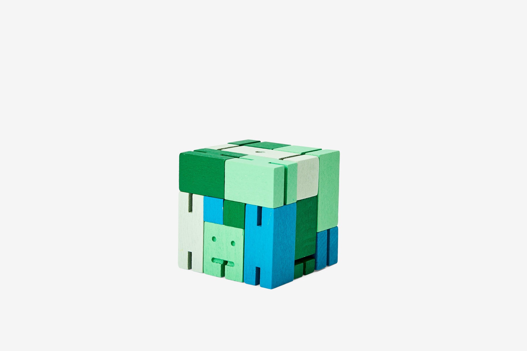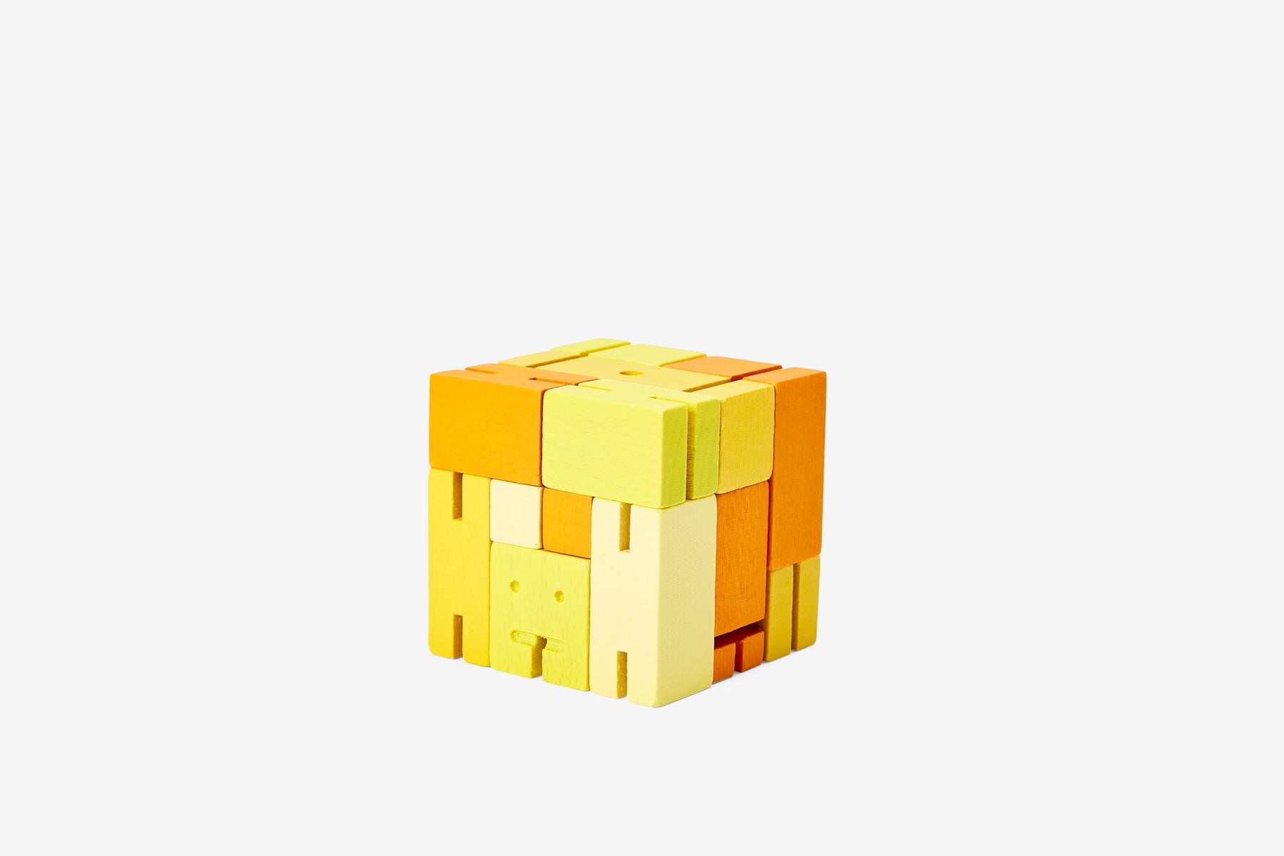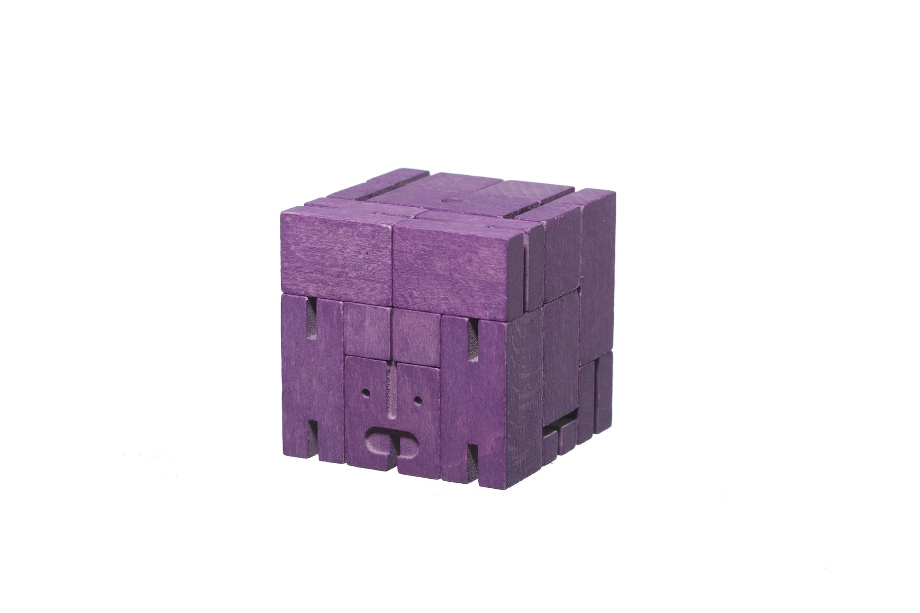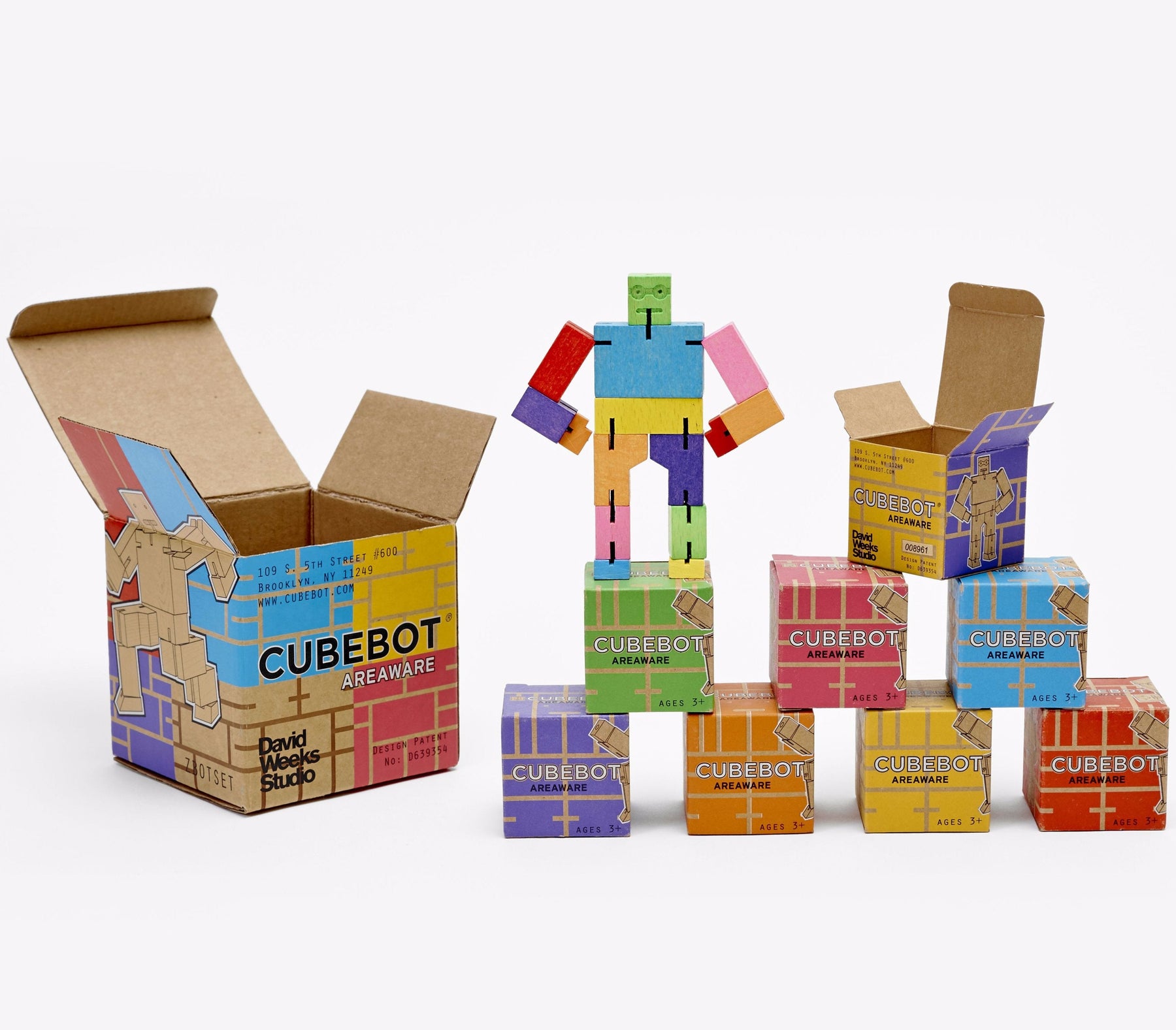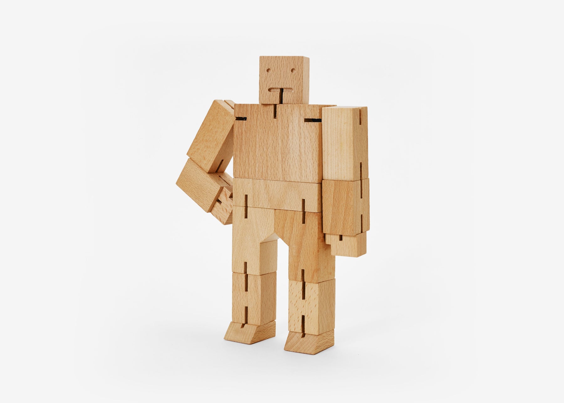 Cubebot® is a wooden toy robot inspired by Japanese Shinto Kumi-ki puzzles. Made from wood and elastic, Cubebot can be positioned to hold dozens of poses. When it's time to rest, Cubebot folds back into a perfect cube. A classic toy for all ages that will endure generations of play.