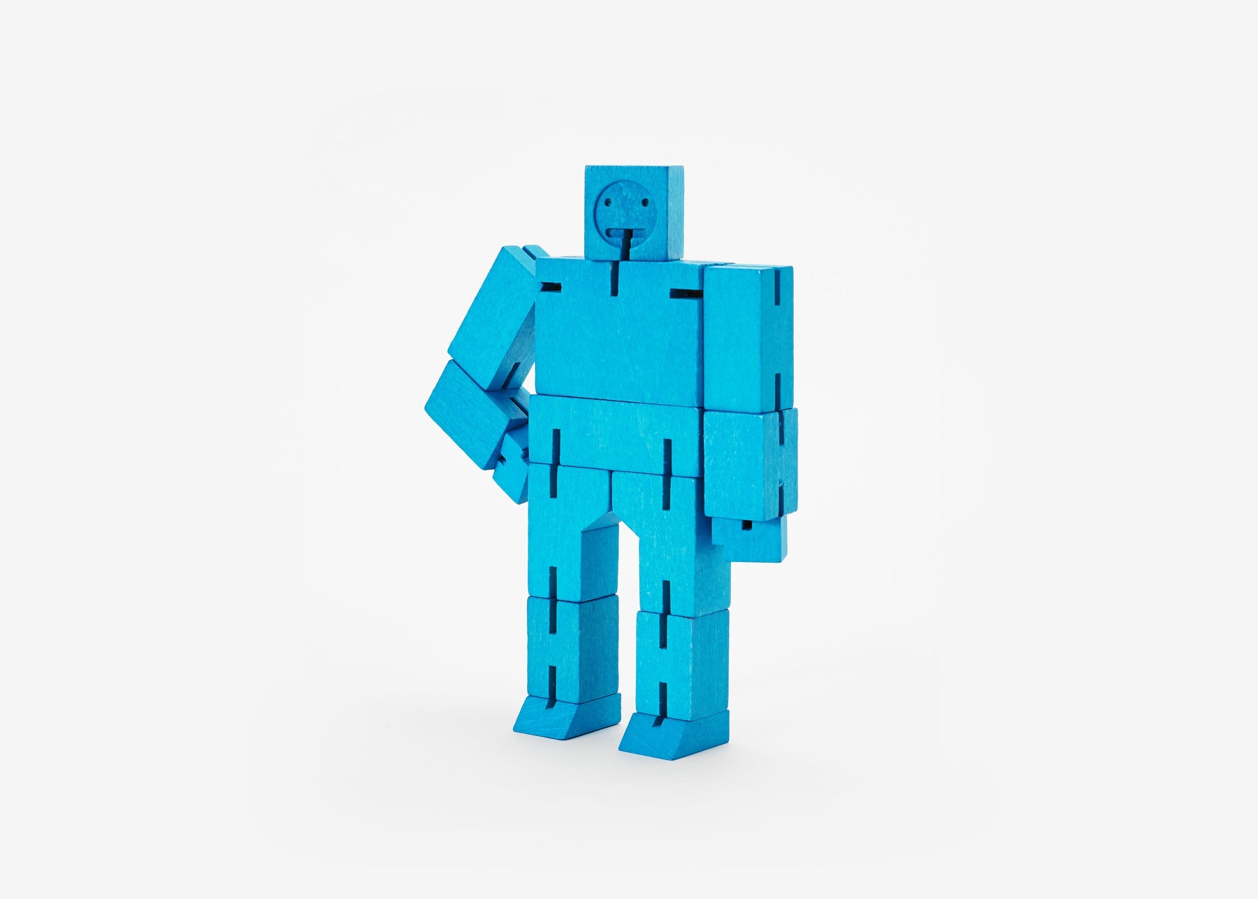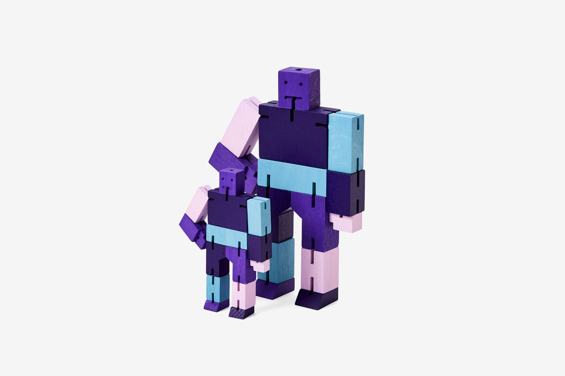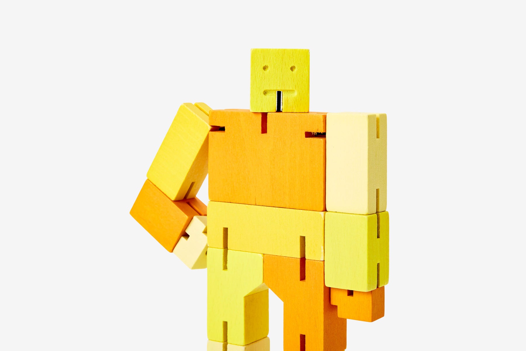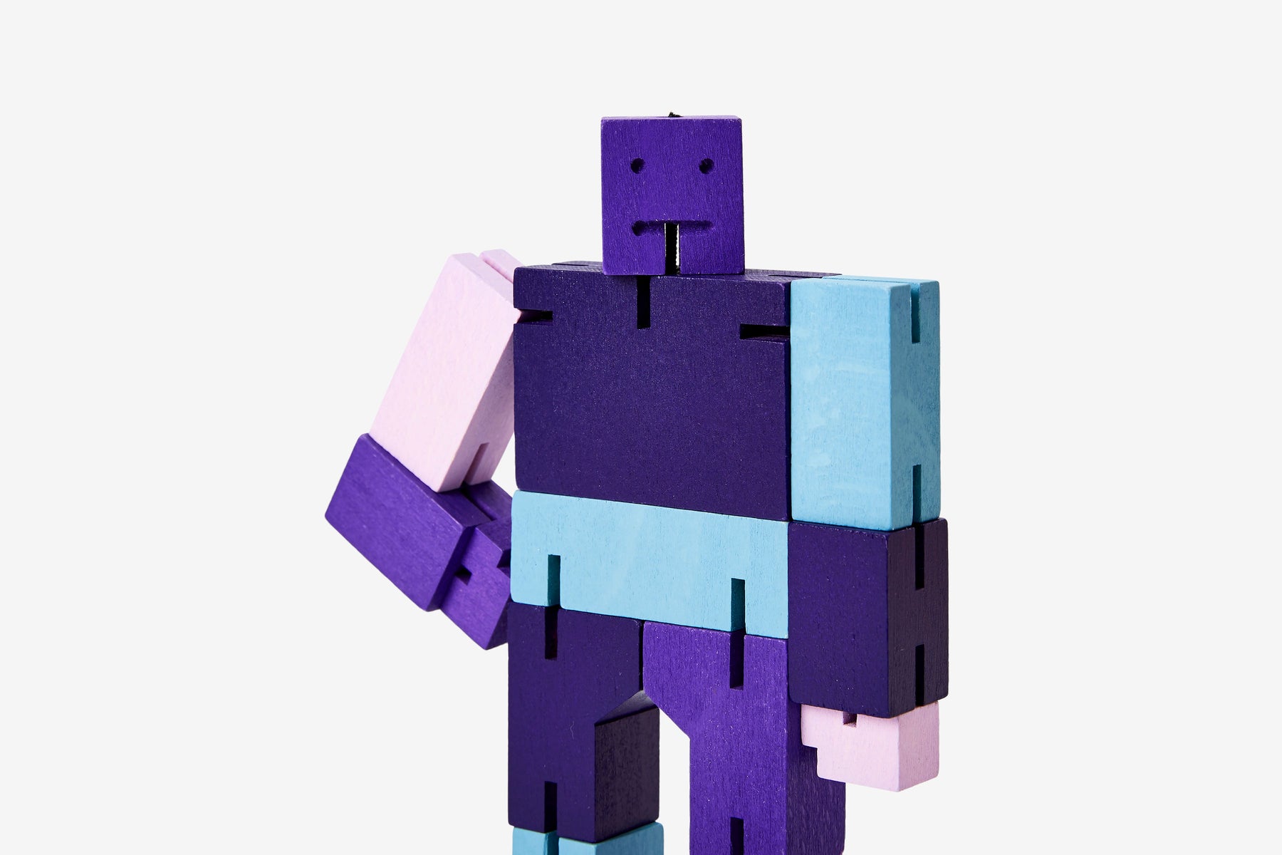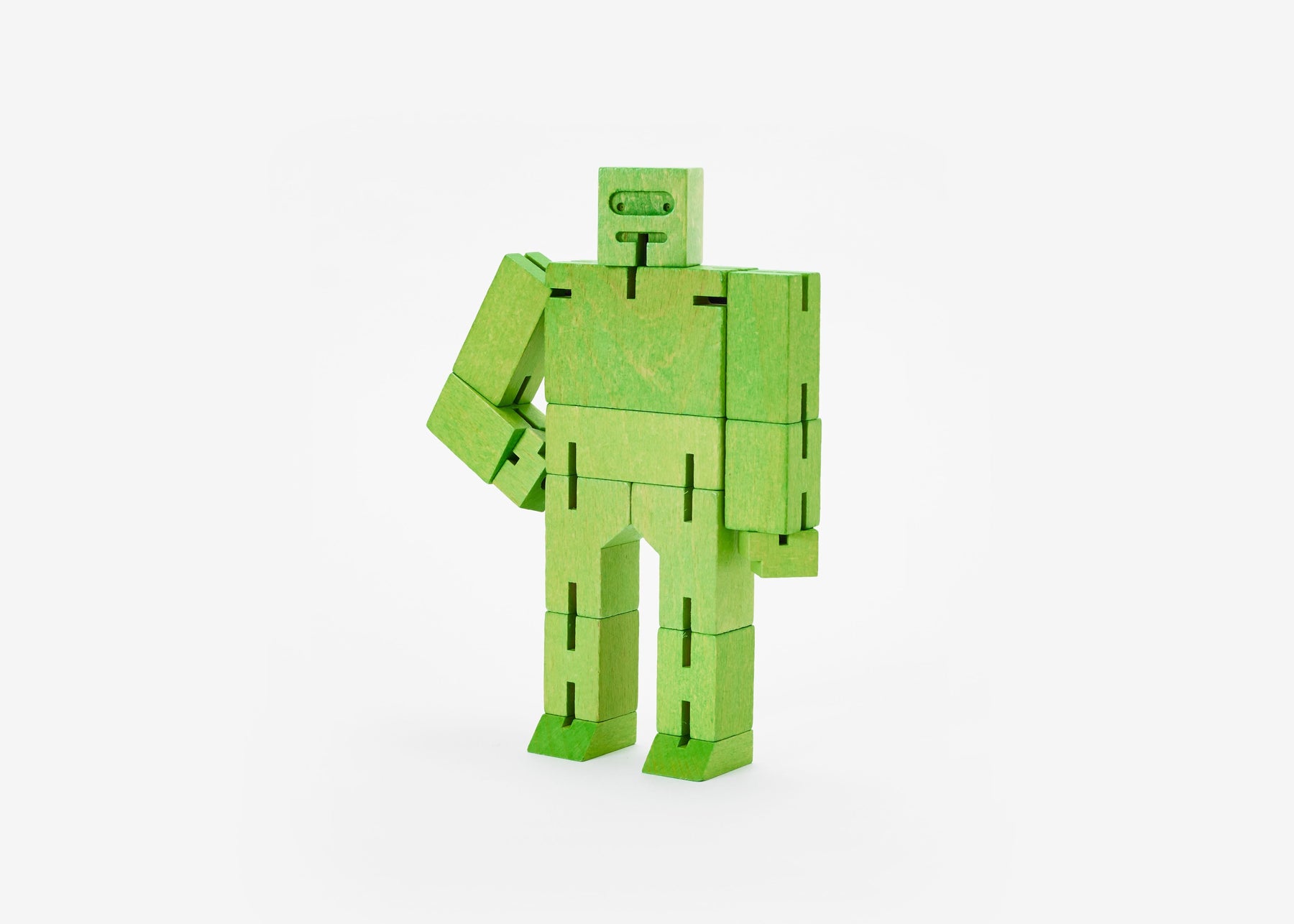 Cubebot® is a wooden toy robot inspired by Japanese Shinto Kumi-ki puzzles. Made from wood and elastic, Cubebot can be positioned to hold dozens of poses. When it's time to rest, Cubebot folds back into a perfect cube. A classic toy for all ages that will endure generations of play.