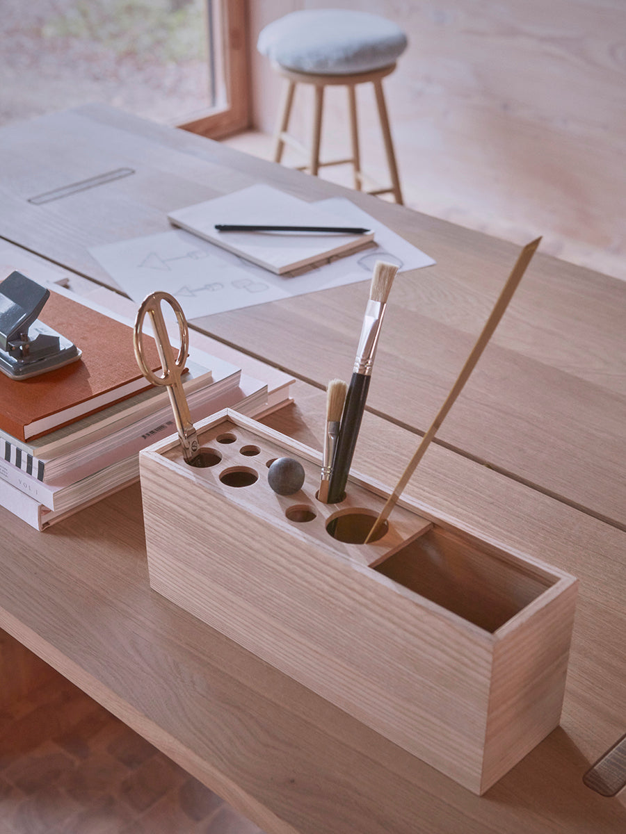Organize your desk with the Hoji Pencil Holder in oak. It will keep your pencils in order while looking elegant and beautiful on your desk.