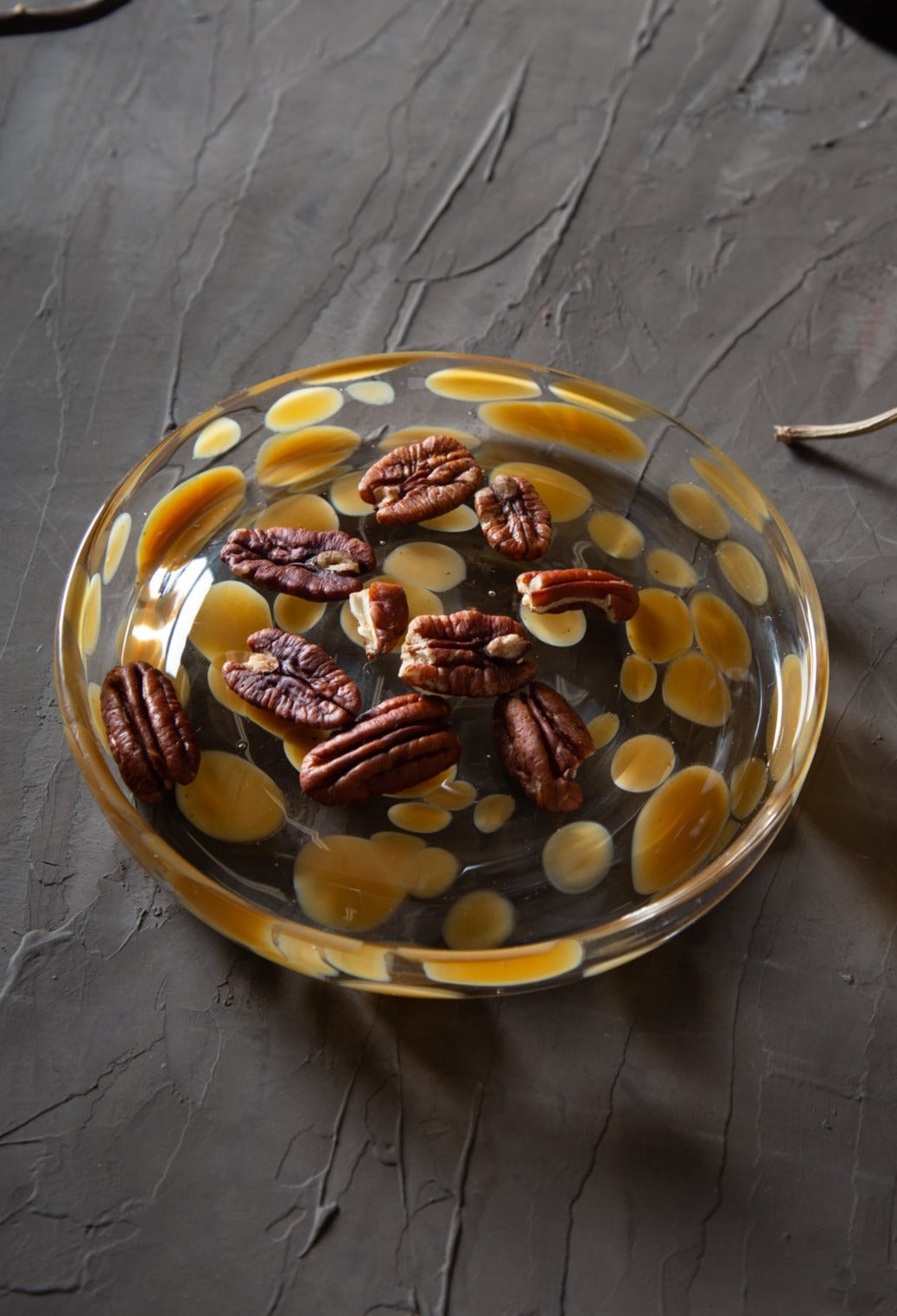Jali Dessert Plate is available with spots in white, amber and rose, and because they are handmade you will discover little beauty flaws.