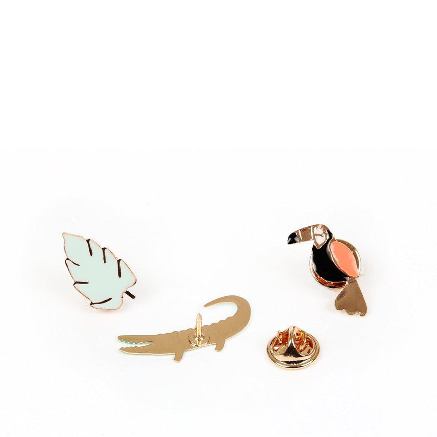 This set of three fabulous enamel pins, on a gilt brass butterfly clasp, are the ideal way to add extra color and interest to your outfits. Go wild with these jungle-themed alligator, toucan and leaf pins.