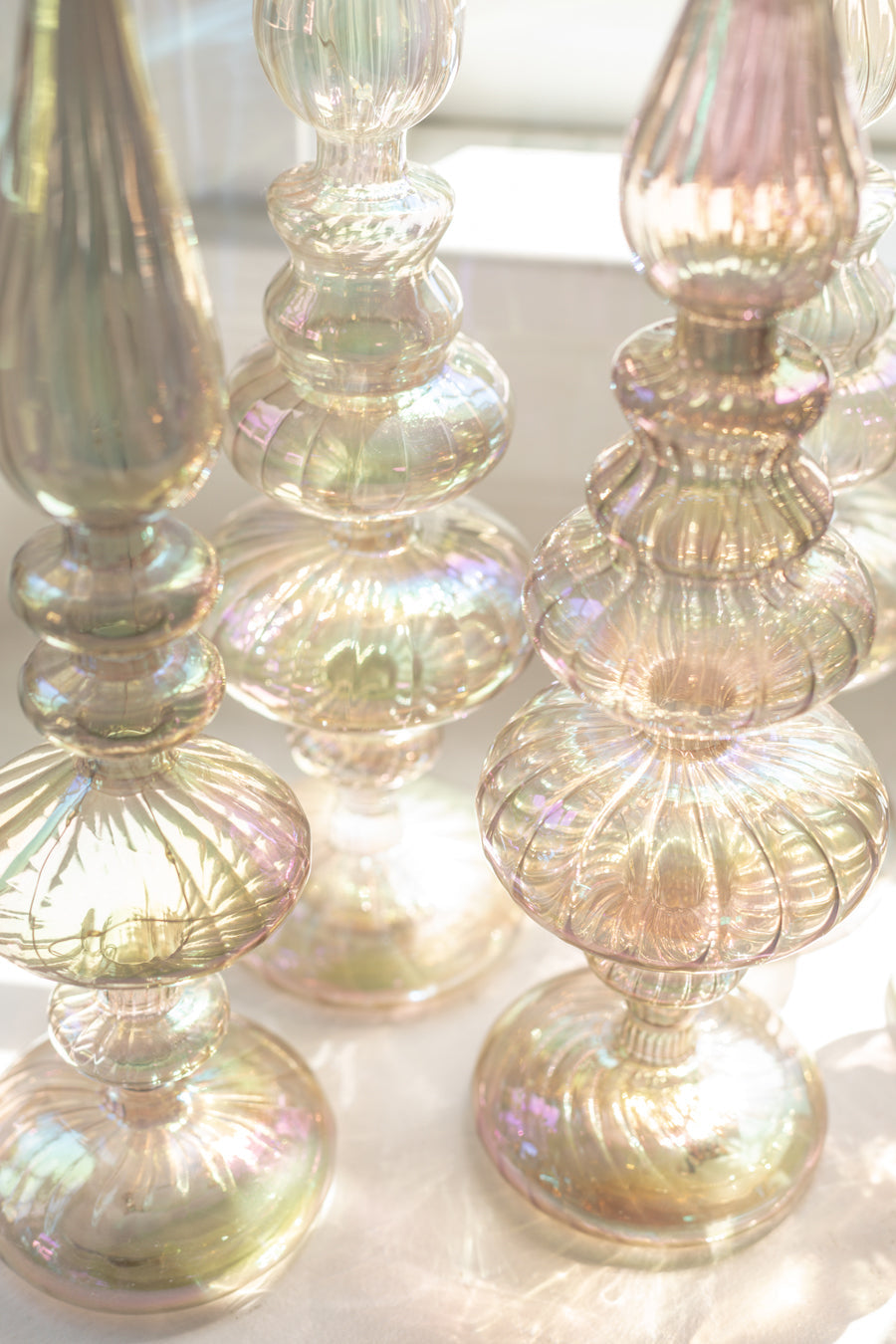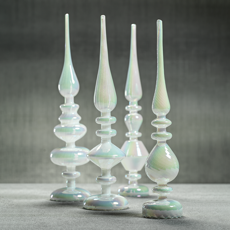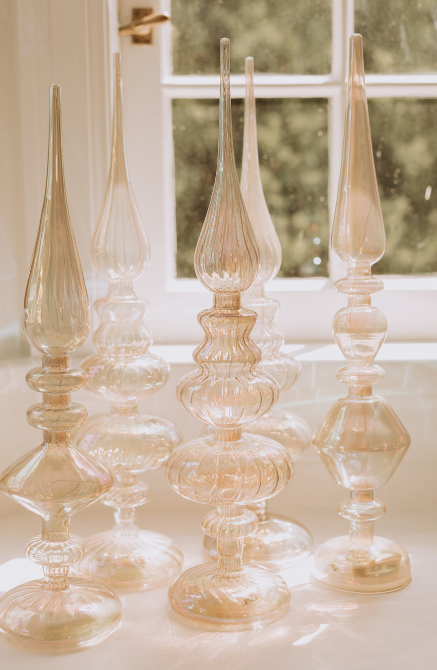 Great accessory for holiday decorating that is perfect to display on a fireplace mantel. Each stands between 17-19.5 inches tall and is made of glass with impeccable craftsmanship. Requires 3 AAA batteries, not included.