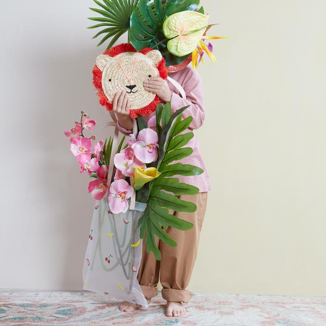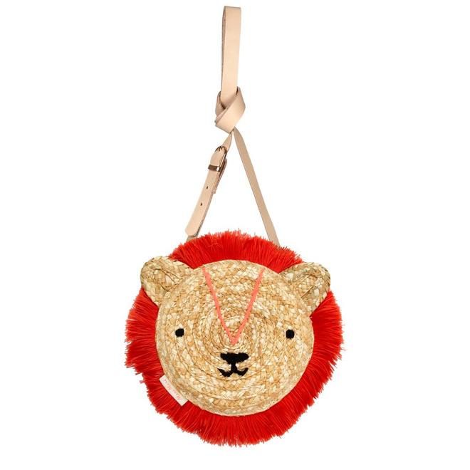 This wonderful lined woven straw lion bag is the perfect accessory for little ones who like to show their wild side. Beautifully crafted, with a sweet embroidered face and a fabulous orange yarn fringe mane. It also features a zip closure and stylish cross body leather strap with brass buckle.