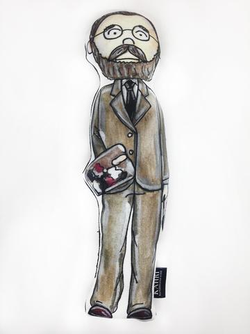 Original watercolor painting illustration artwork by KahriAnne Kerr of Matisse printed on Linen/Cotton Canvas with solid black linen back and filled with poly fiber fill to create a cute little fashion doll. Made with love in NYC.