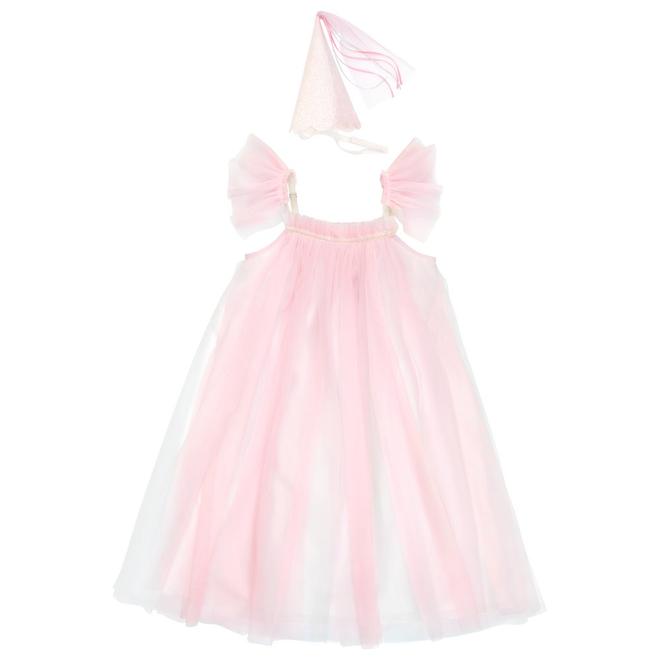 This beautiful magical princess dress-up outfit contains a gorgeous tulle dress and ribboned princess hat. The dress is beautifully crafted with four tiers of tulle ruffles and has iridescent sequin elastic detail. The pretty princess hat is glittery pink with ribbons.
