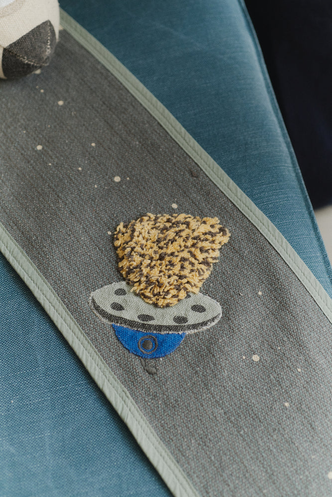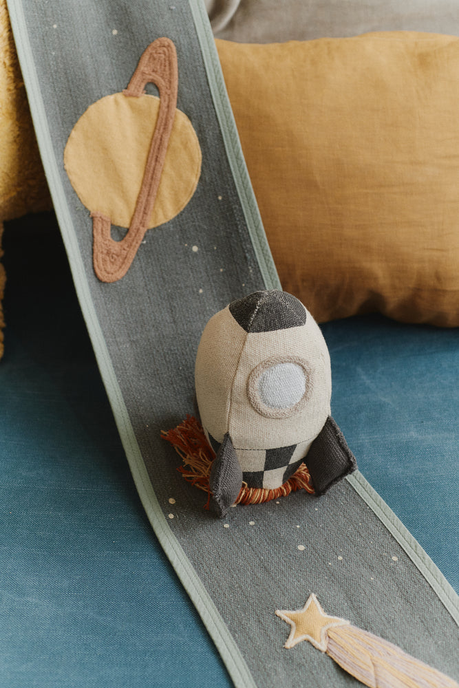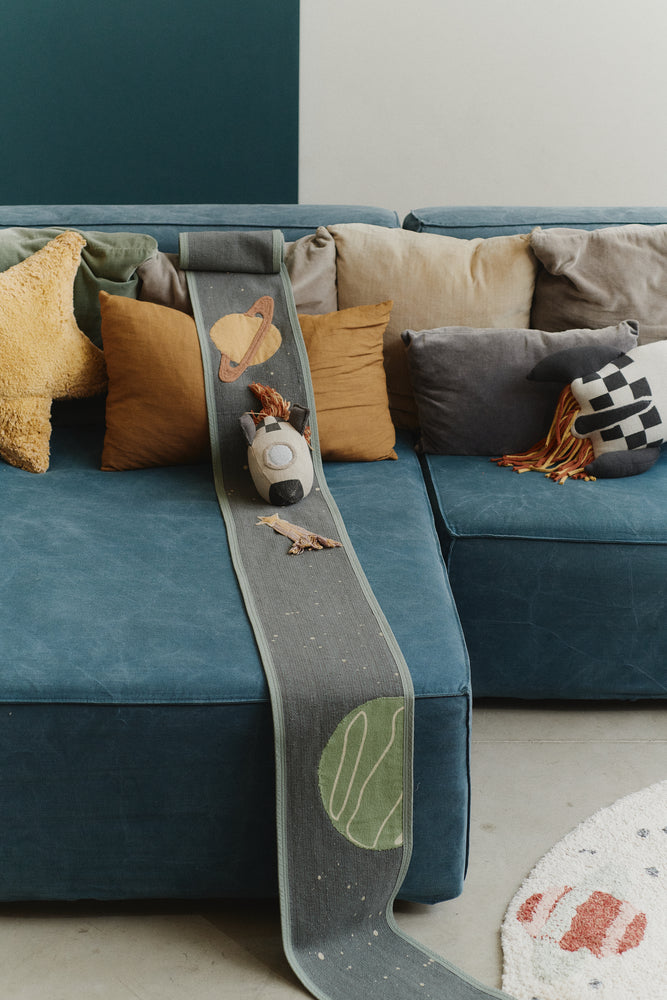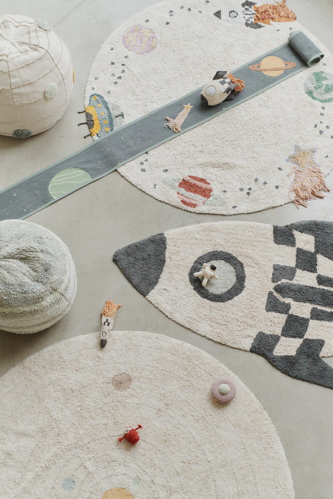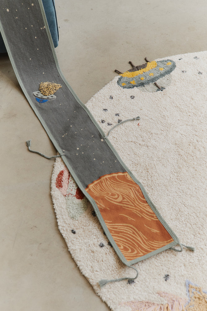 Put on your favorite galaxy outfit and prepare for an interstellar adventure with our textile Milky Way Ride & Roll! This handcrafted toy is made from scraps and features a soft rocket in natural and dark grey tones, complete with a fringed edge that mimics rocket fire. Unroll its 4-meter canvas with tufted details that evoke space elements like spaceships and shooting stars in various colors and textures. We are taking off!