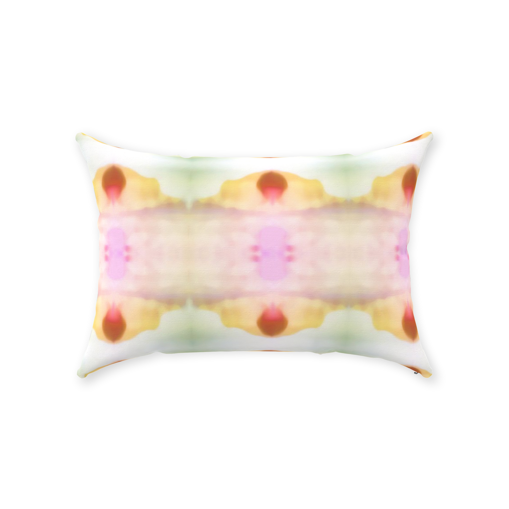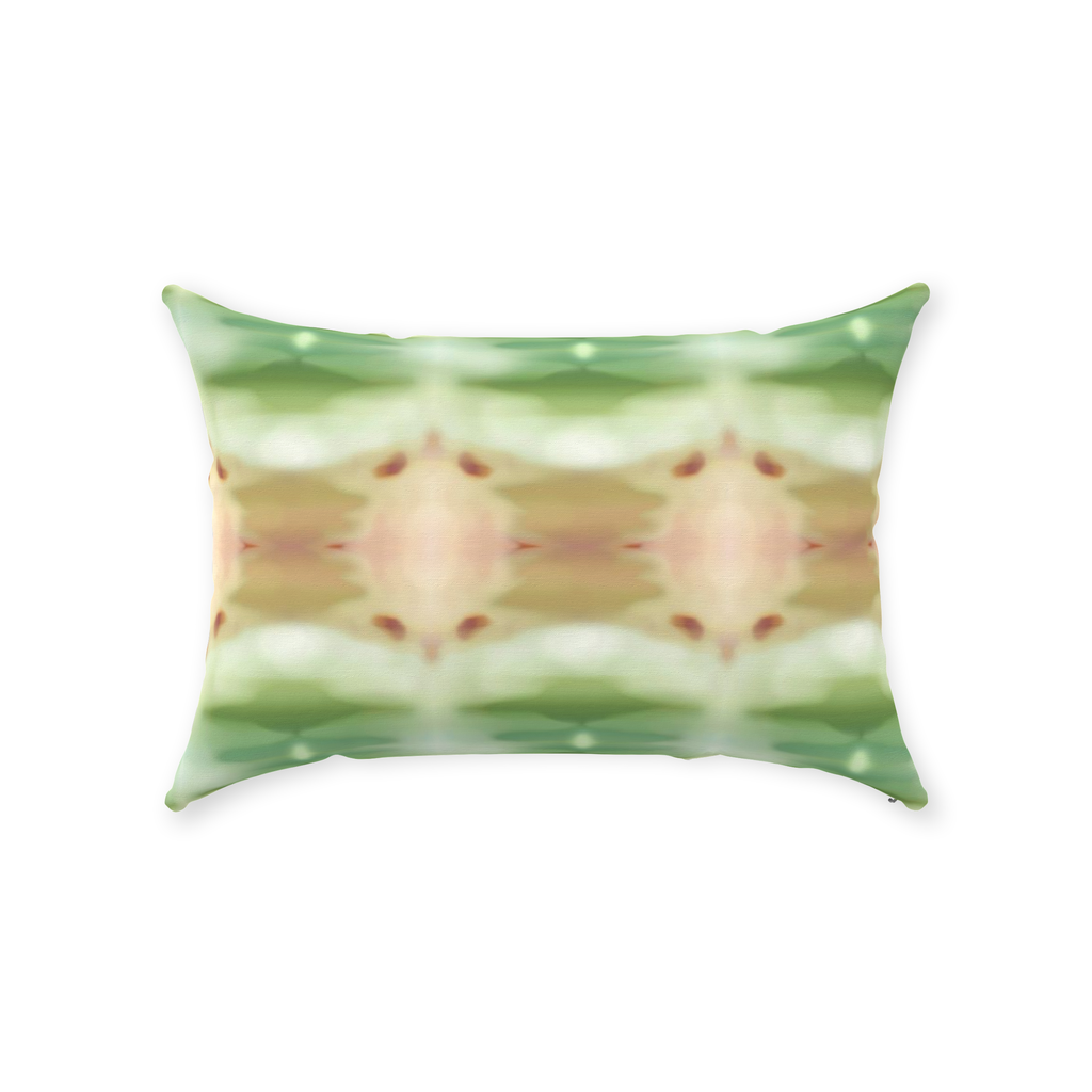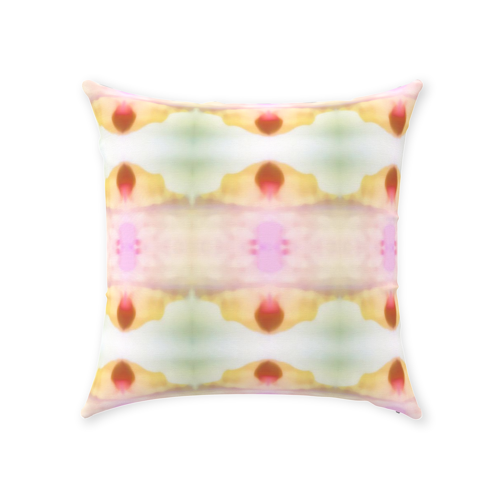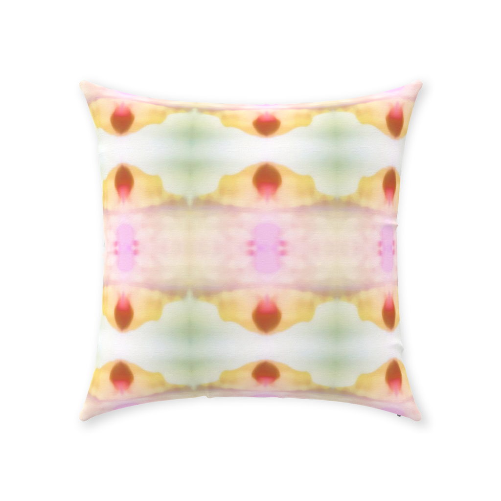Pastel, watercolor inspired print, warm pinks & peaches on one side, with soft greens and beige on the other.