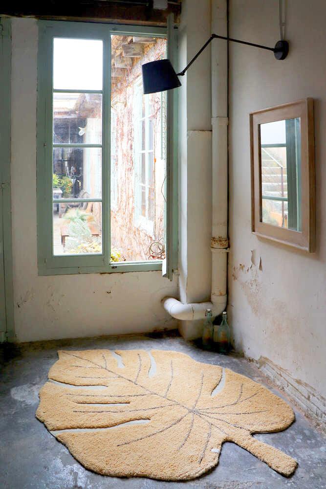 Leaves in nature are of many colors, not just green. This piece is a new take on our classic Monstera rug in a subdued shade of Honey-color yellow. A bold shape but in a color that blends in better with any decor.