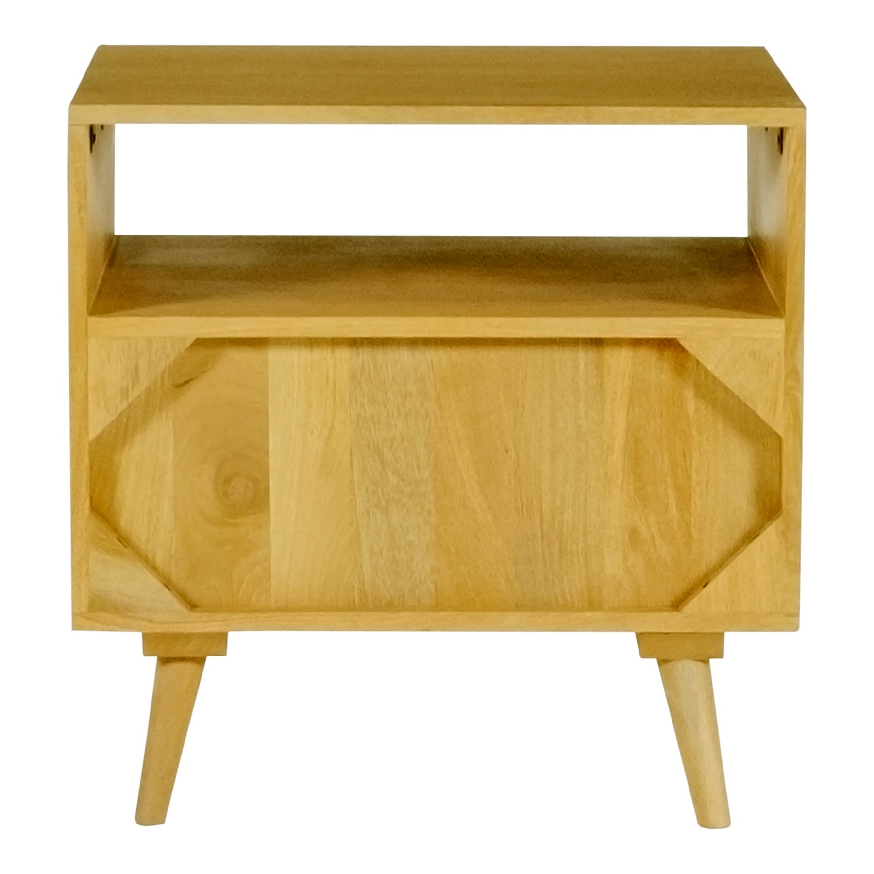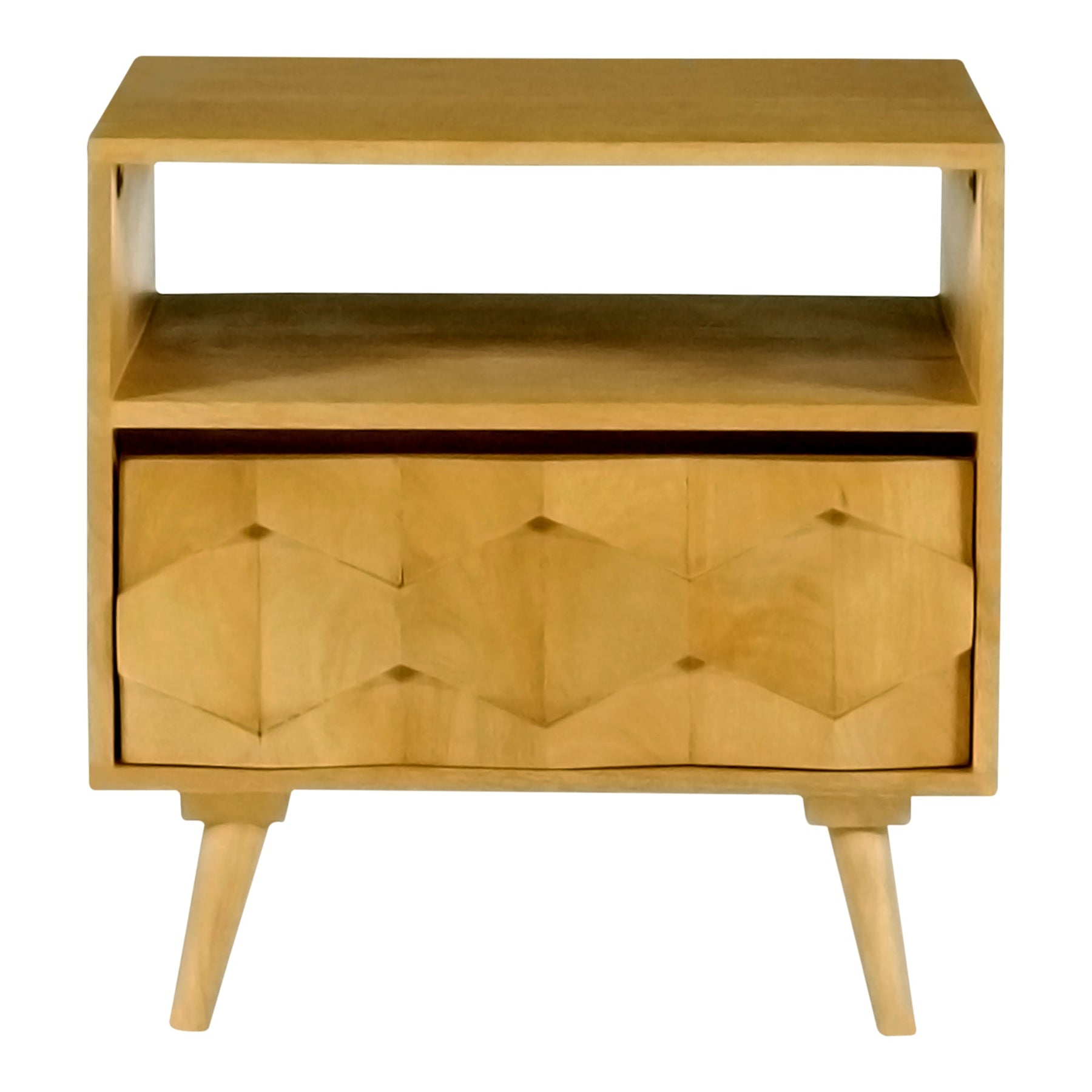 The O2 nightstand is a retro-inspired with a modern twist. Constructed with solid mango wood, this piece makes it resistant to major wear and tear. Its warm tone and intricate drawer front provides character and ample storage to your bedroom space.