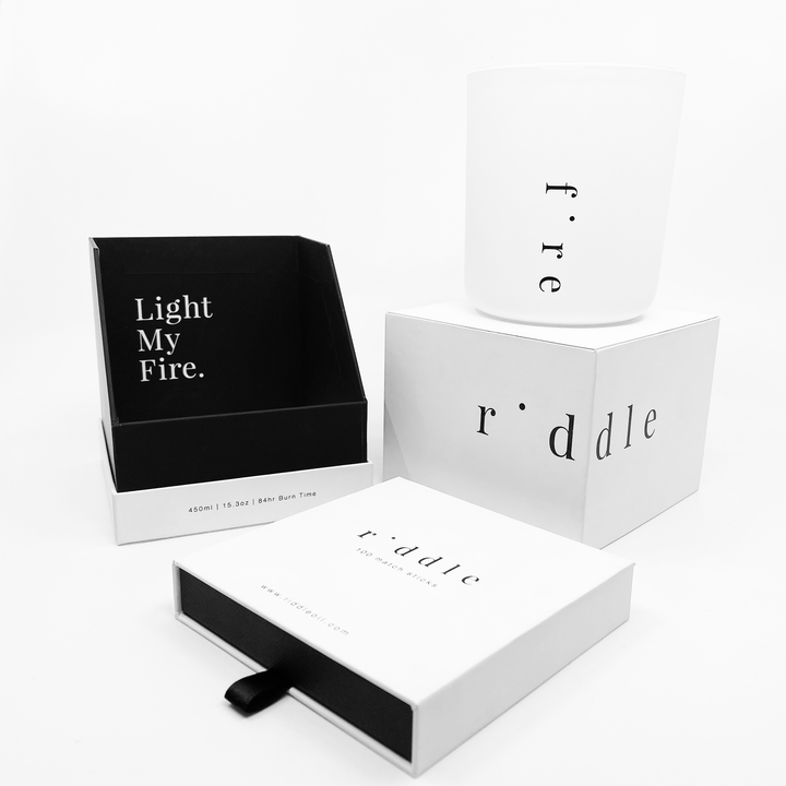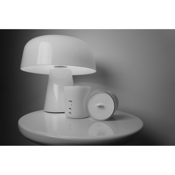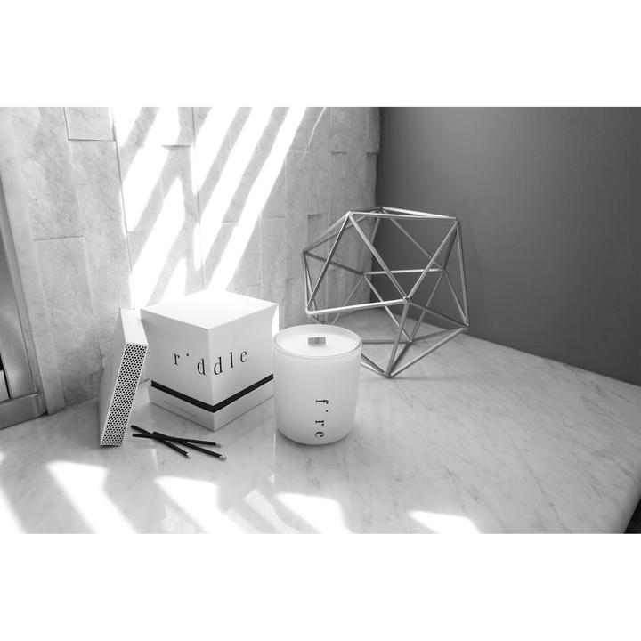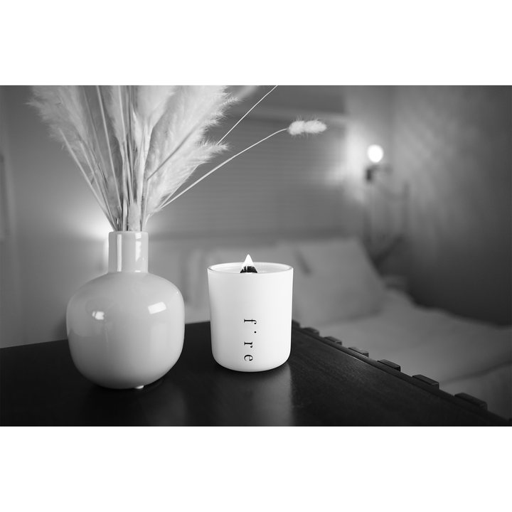 Our Fire Candle is encased in a sturdy glass vessel with a matte white coating and minimal design. Our wick is made from wood and has a faint crackling sound. The wax that we use is soft with a low melting point making the candle burn slow and low. The burn time is listed at 84 hours but usually lasts closer to 108 hours.