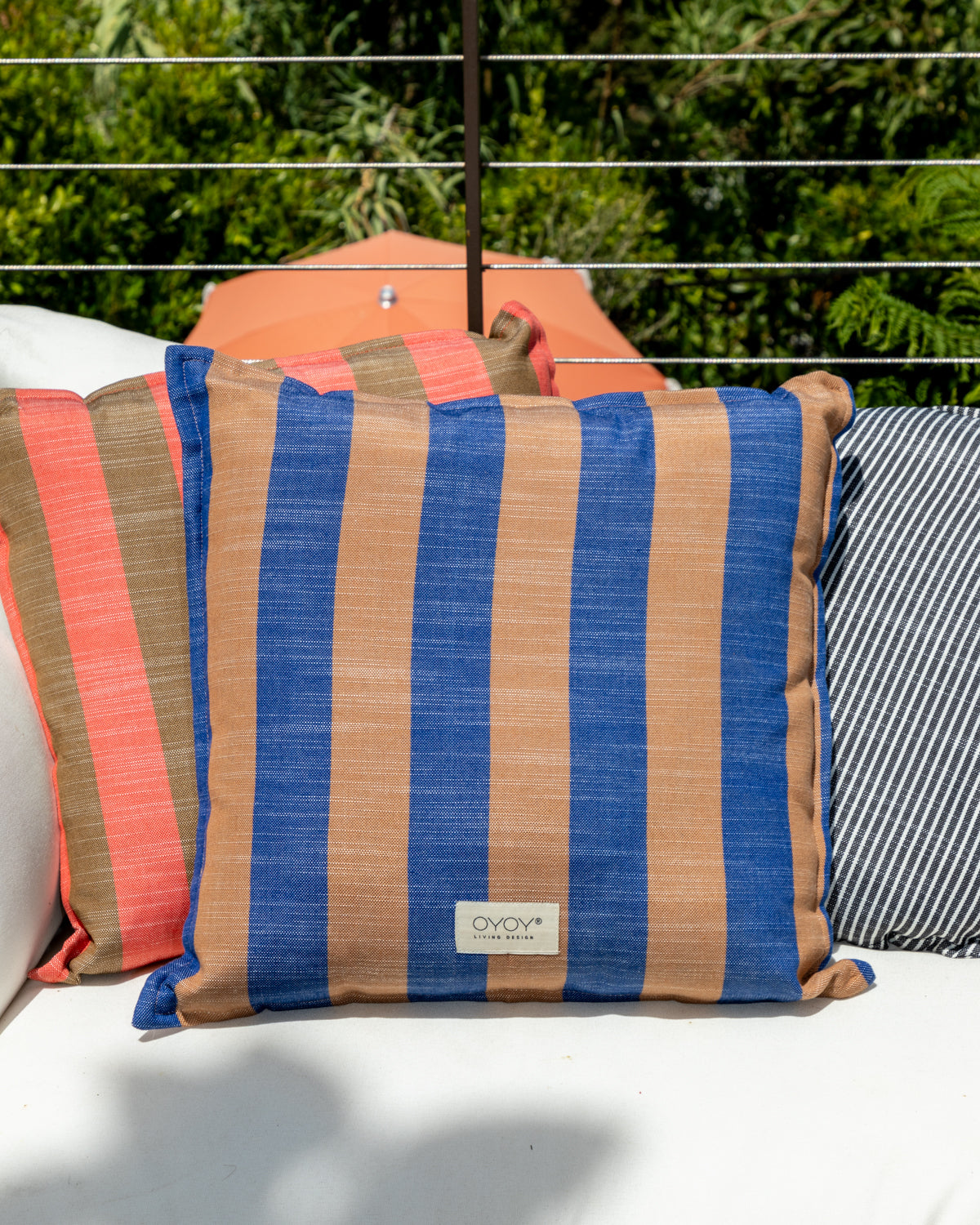 Our Kyoto Outdoor Cushions in recycled polyester are perfect on the terrace or balcony. The square cushion in caramel and blue has a simple and recognizable design with stripes, which creates a cosy and personal expression.