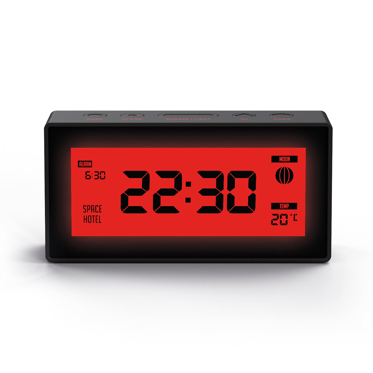 Black rectangular LCD alarm clock with a multi-function dial and a choice of three colour options. The Robot 10 comes in bold red or multi-coloured dial options to give it an on-trend yet retro style.
