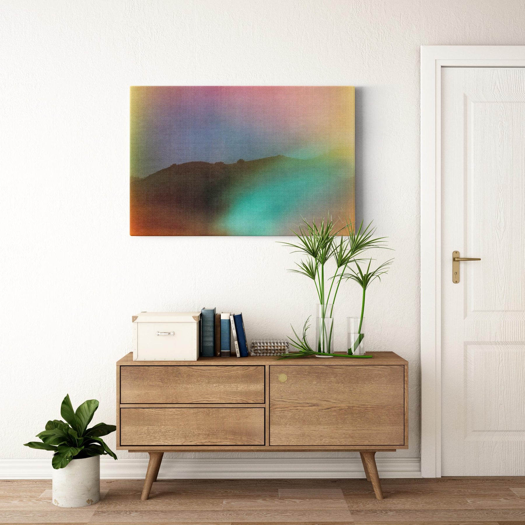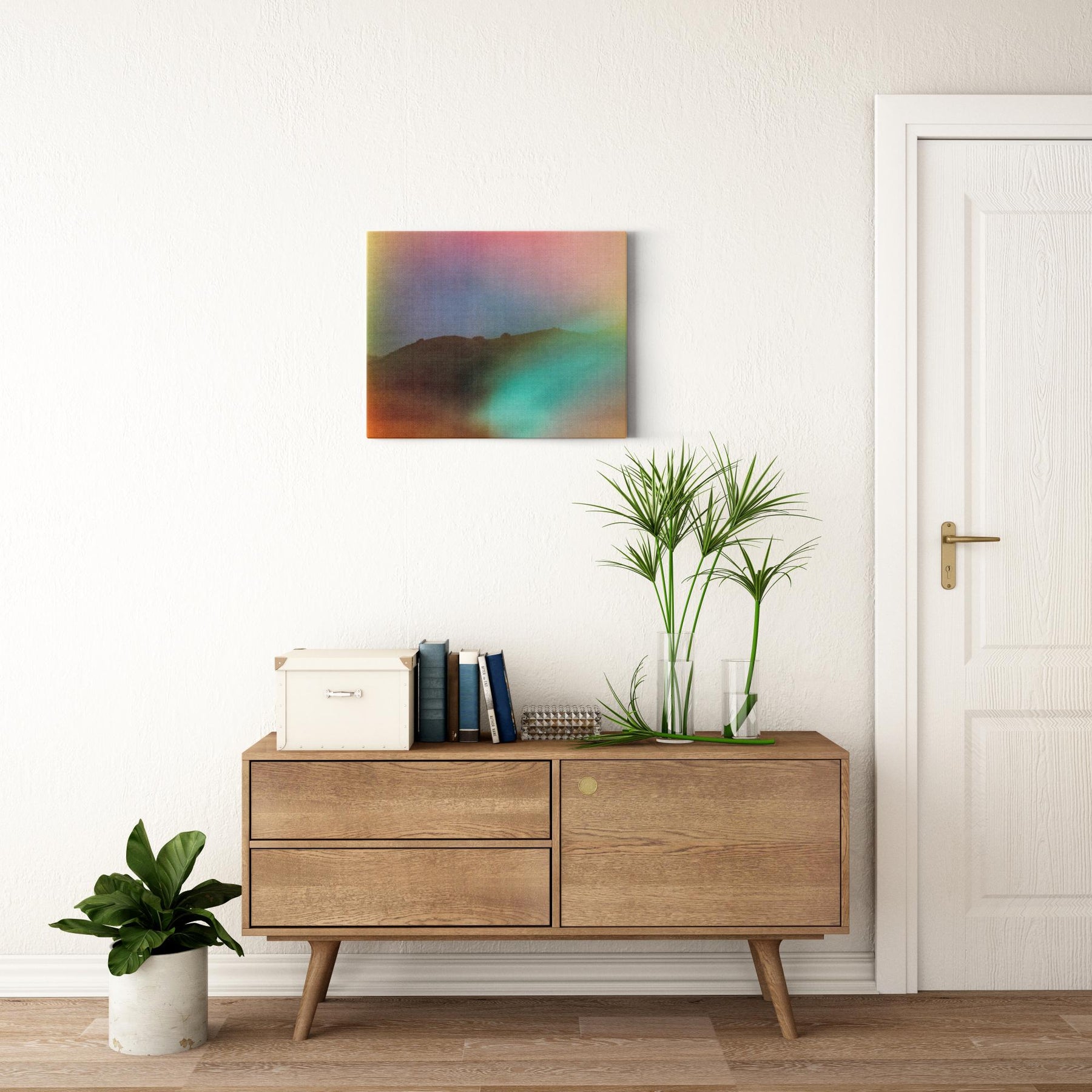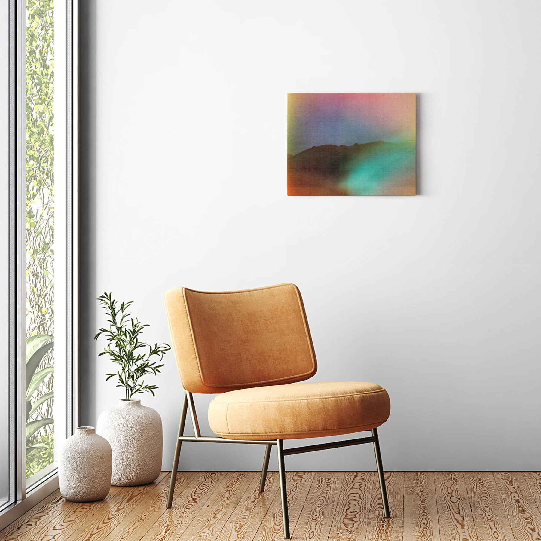 Our gallery-wrapped canvas is printed on artist-grade poly-cotton blend canvas and backed with hard, high-density wood fiberboard and a plastic frame. 1.25" thick