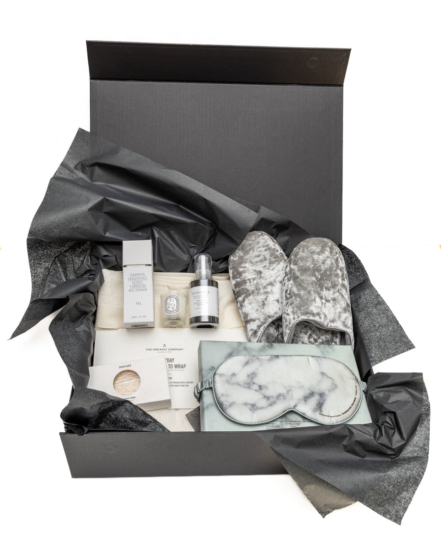 The Spa Day box is loaded with all the ingredients for a perfect staycation. The thoughtful gift for the loved one in your life who needs an excuse to relax. Featuring a detoxifying binchotan charcoal cleansing mask, exfoliating konjac tree bath sponge, extra plush velvet slippers, scented Dyptique votive and omnibus diffuser, and an organic terry towel wrap lounging.