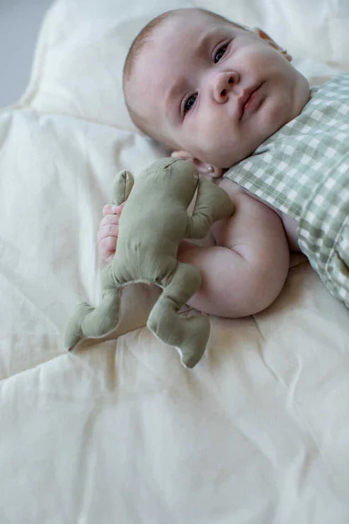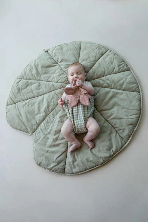 Babies love a good tummy time session and a giggle! Watch them reach their development milestones, one step at a time, flowing by on this soft water lily pad-shaped play mat. It comes with a soft cotton stimulation toy in the shape of a dragonfly with crinkling white wings and a rattle inside, a pink flower with crinkling petals, or stuffed frog with a rattle inside.
